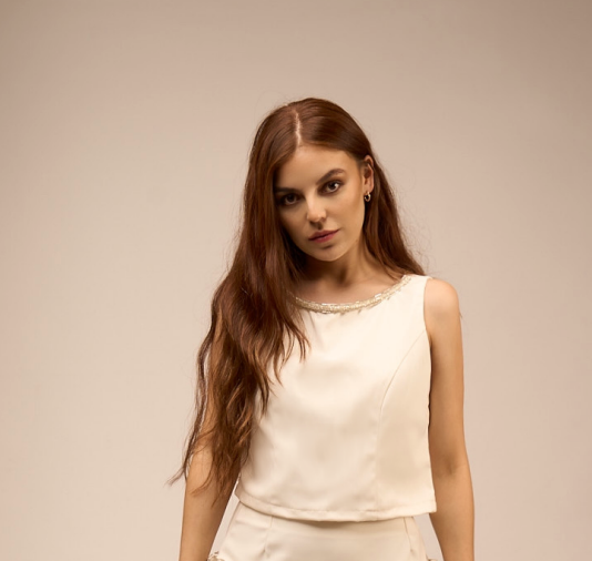 Este top presenta un tejido de crepe con detalles brillantes en el cuello. Esta elegante pieza es perfecta para agregar un toque de glamour a tu guardarropa.