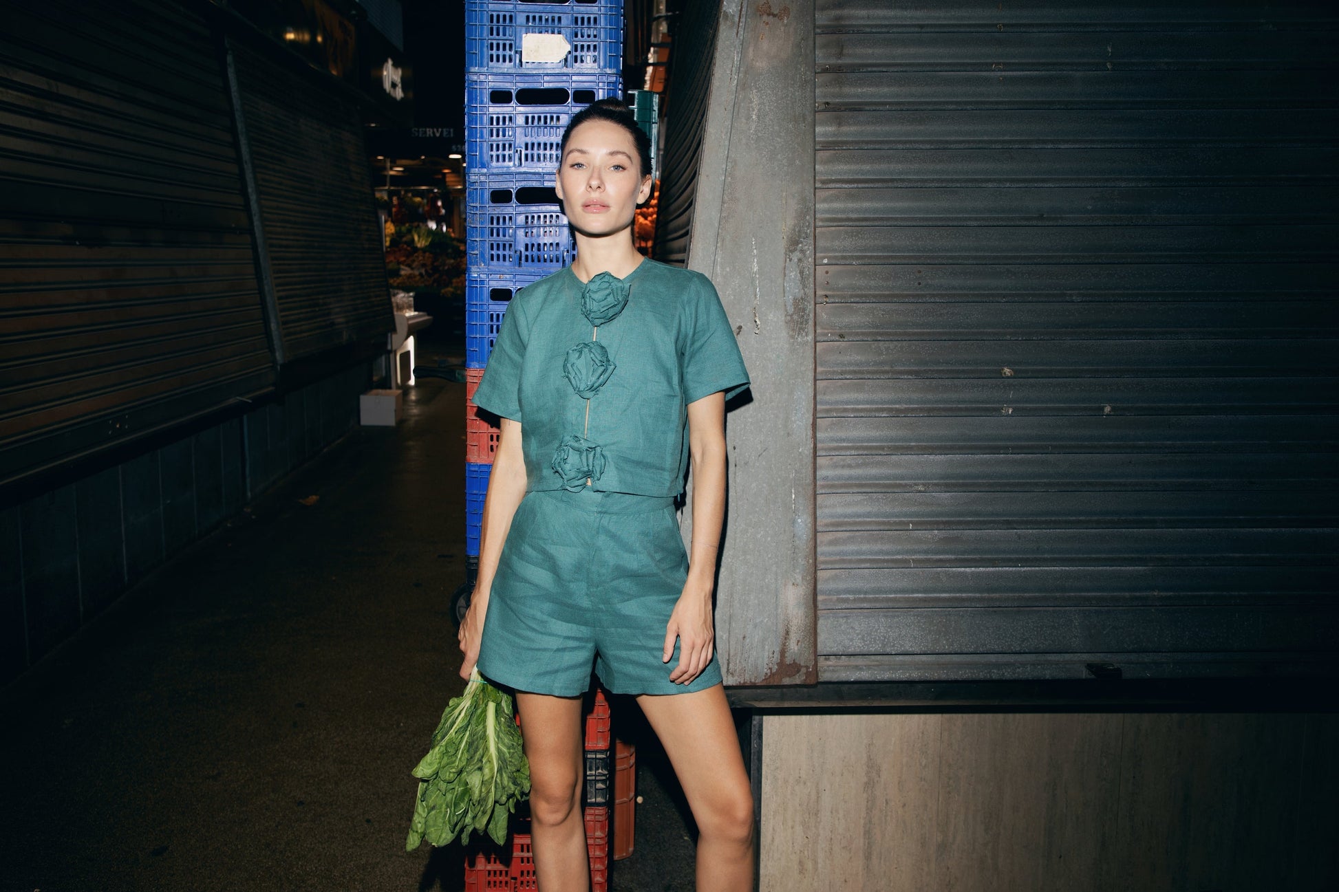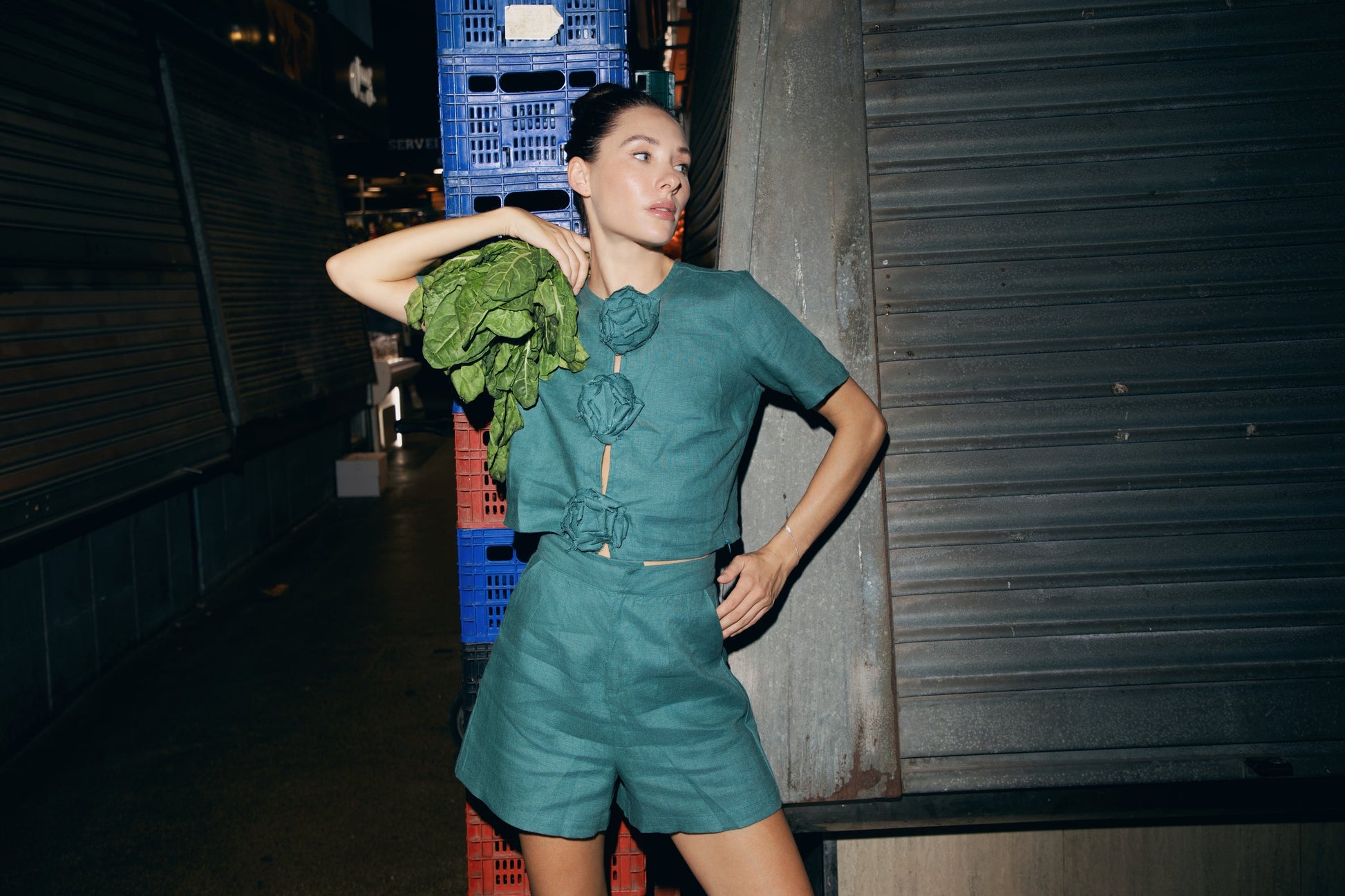 Blusa manga corta con detalle de aberturas en parte delantera y flores superpuestas y cierre con cremallera invisible al costado.