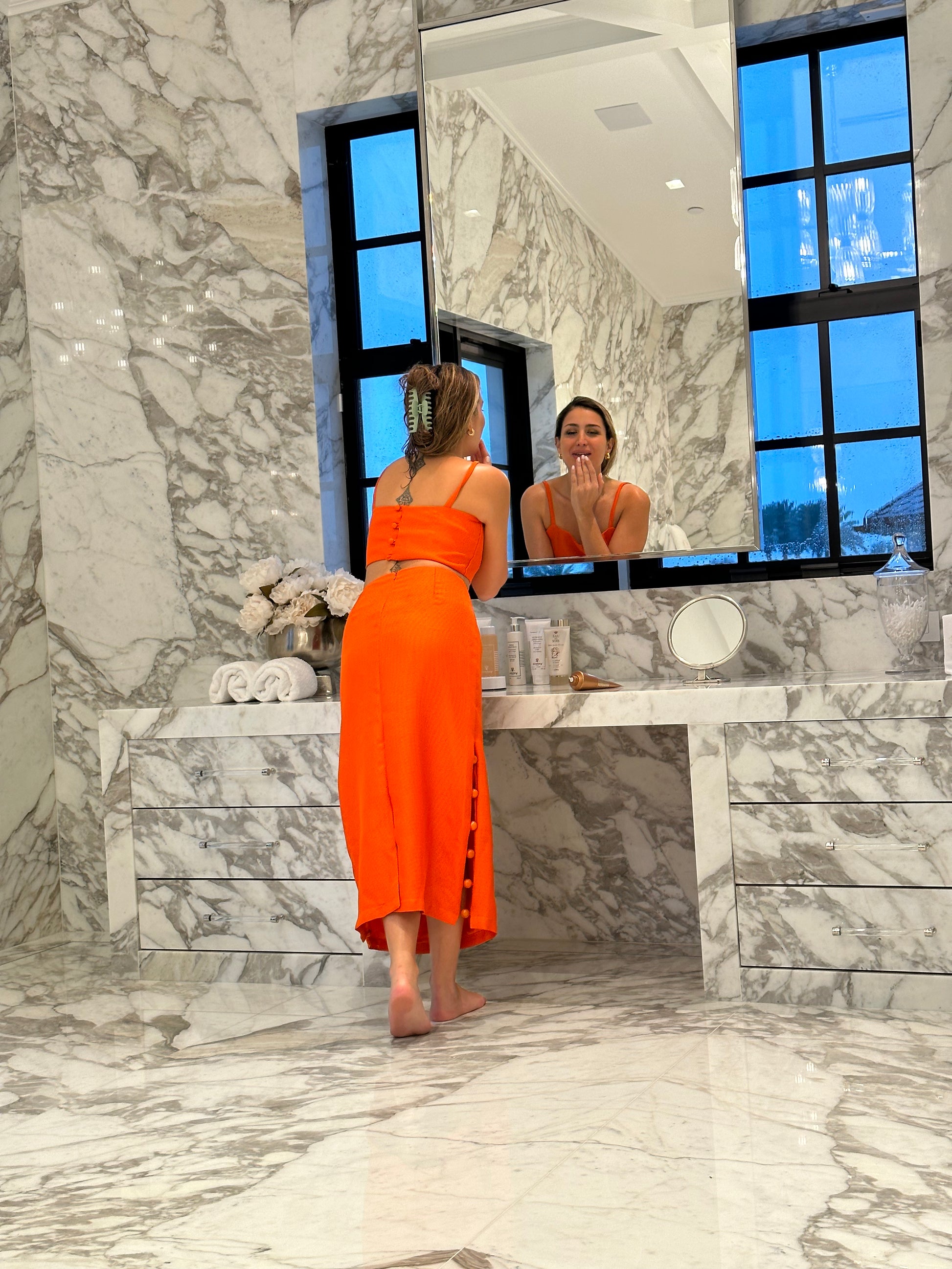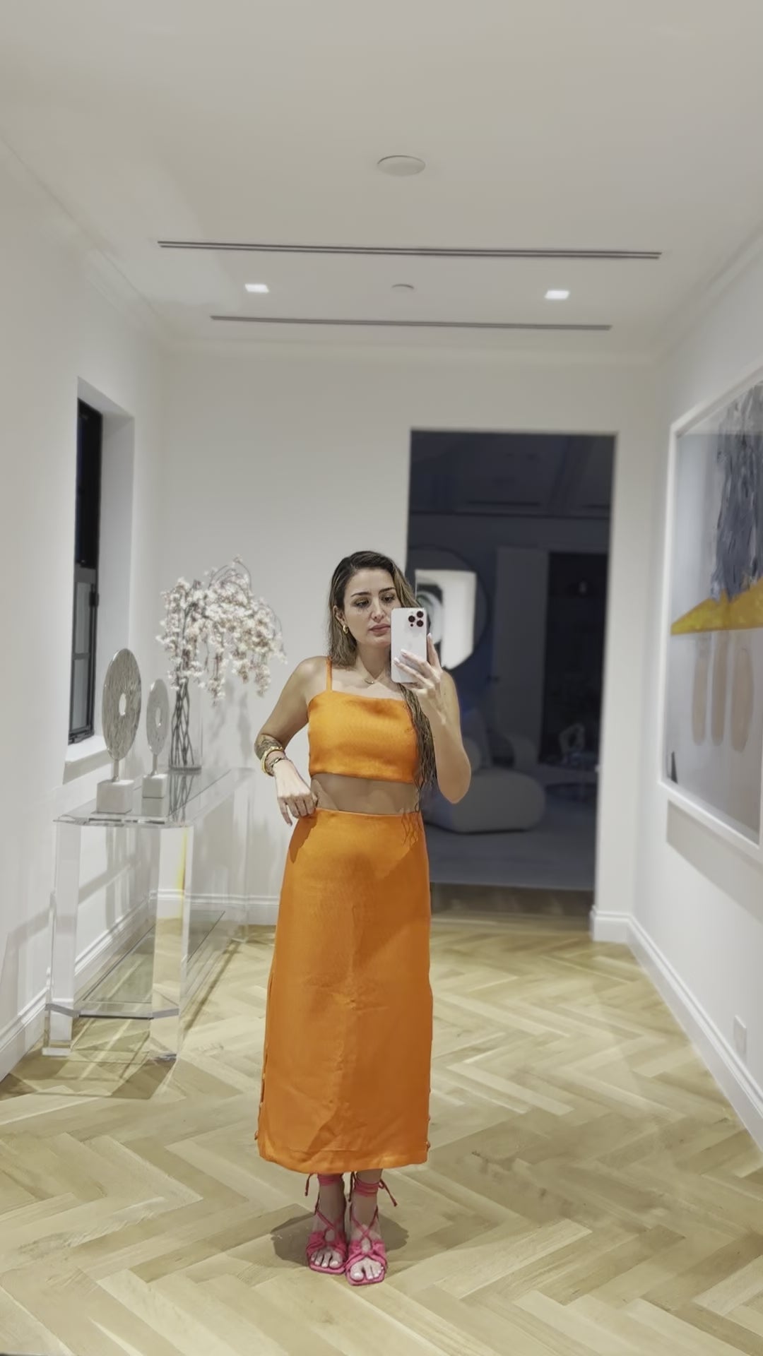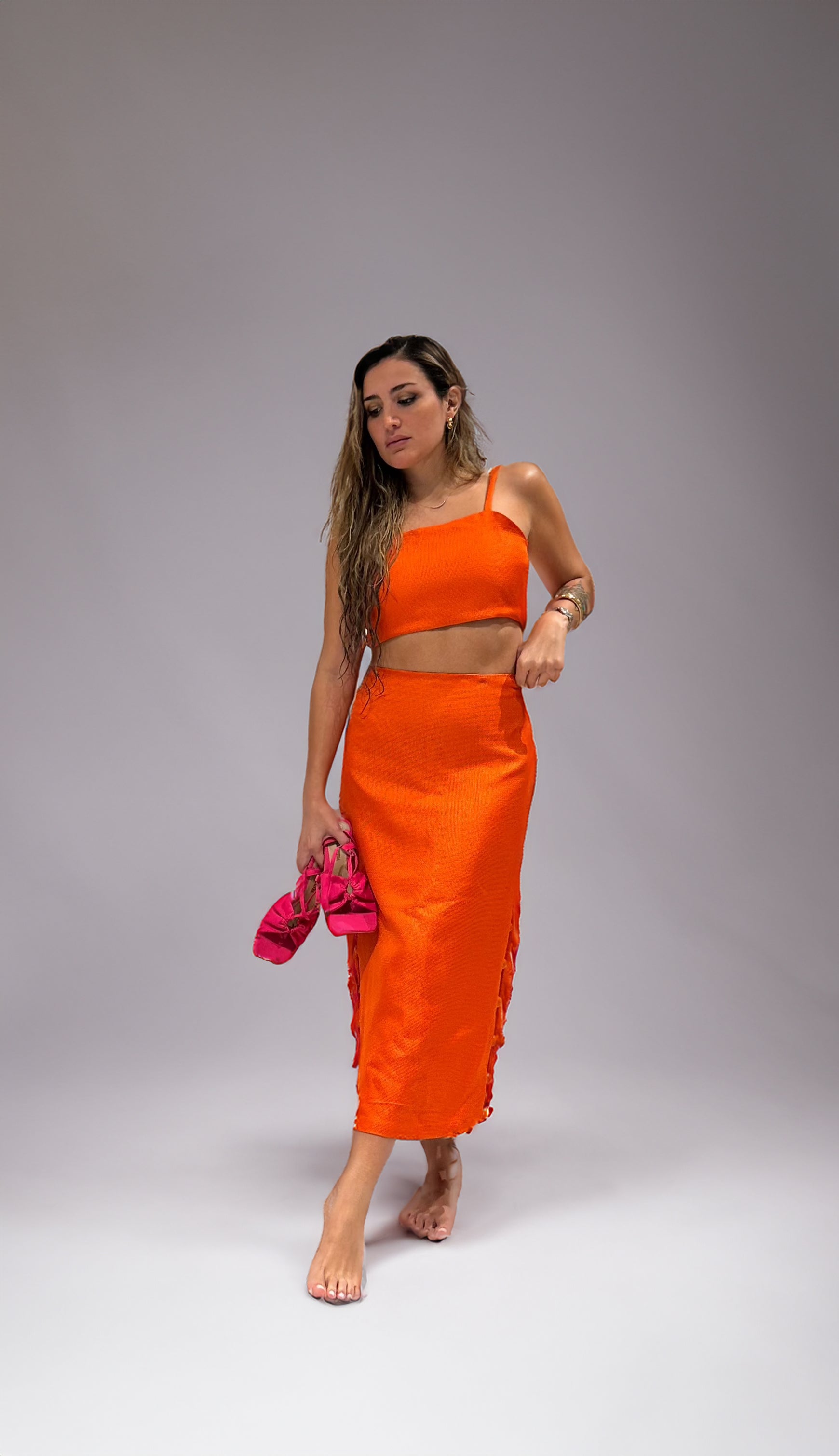 This two-piece Orange Blossom Set features a beautiful skirt and cropped top, making it a bestseller. Made with high-quality materials, this set offers comfort and style, perfect for any occasion. Get yours today and elevate your wardrobe with this stunning set.