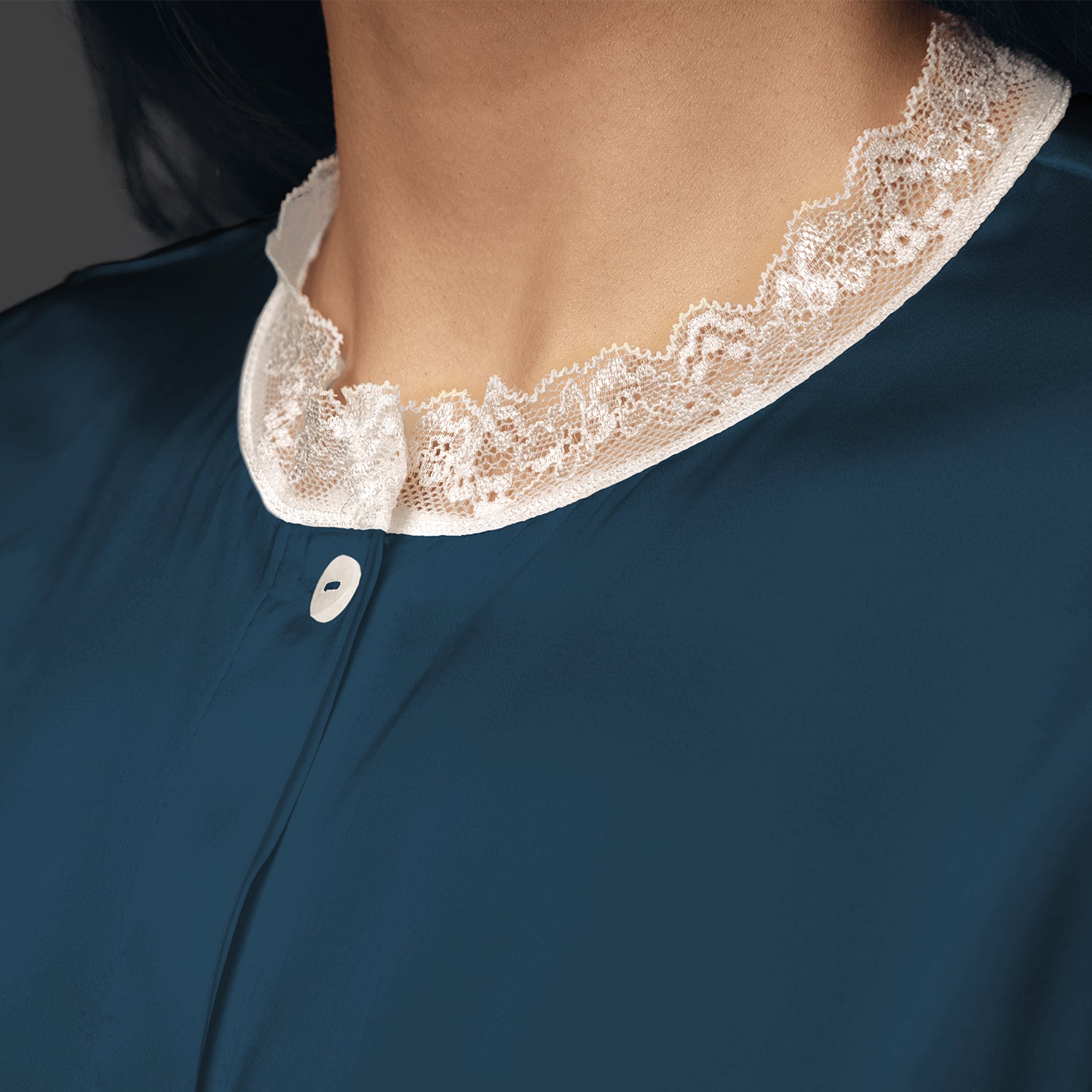 Nuestra hermosa camisa Claude adornada con detalles de ribetes en puños y cuello te hará sentir tan sofisticada como eres. Camisa con botones ocultos. Lleva tu camisa Claude de tu dormitorio a la calle vistiéndola con pantalones modernos.