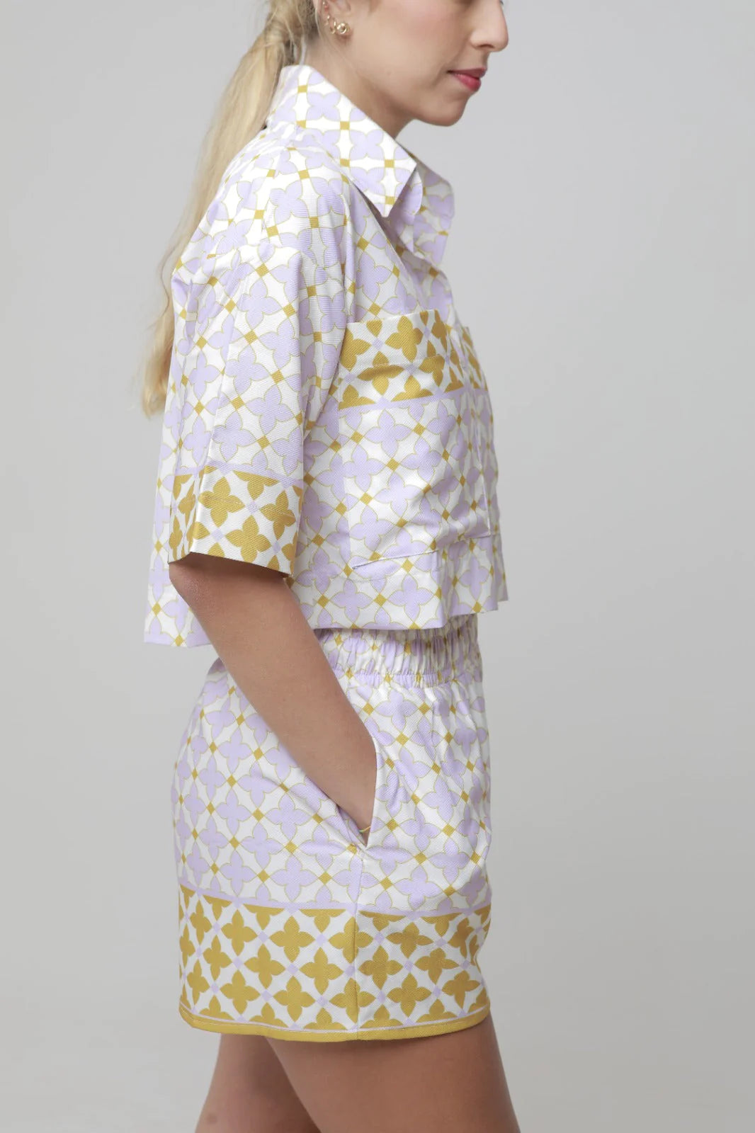 Conjunto de short y blusa corta con bolsillos.
