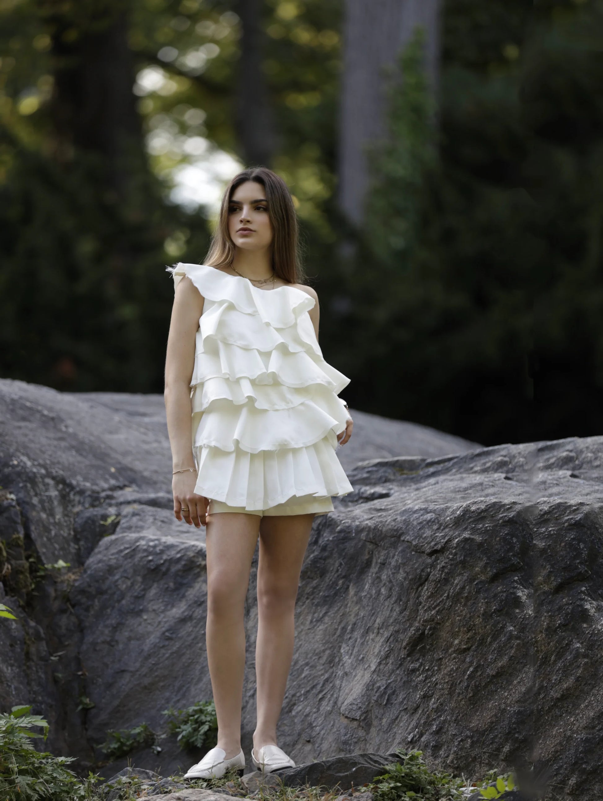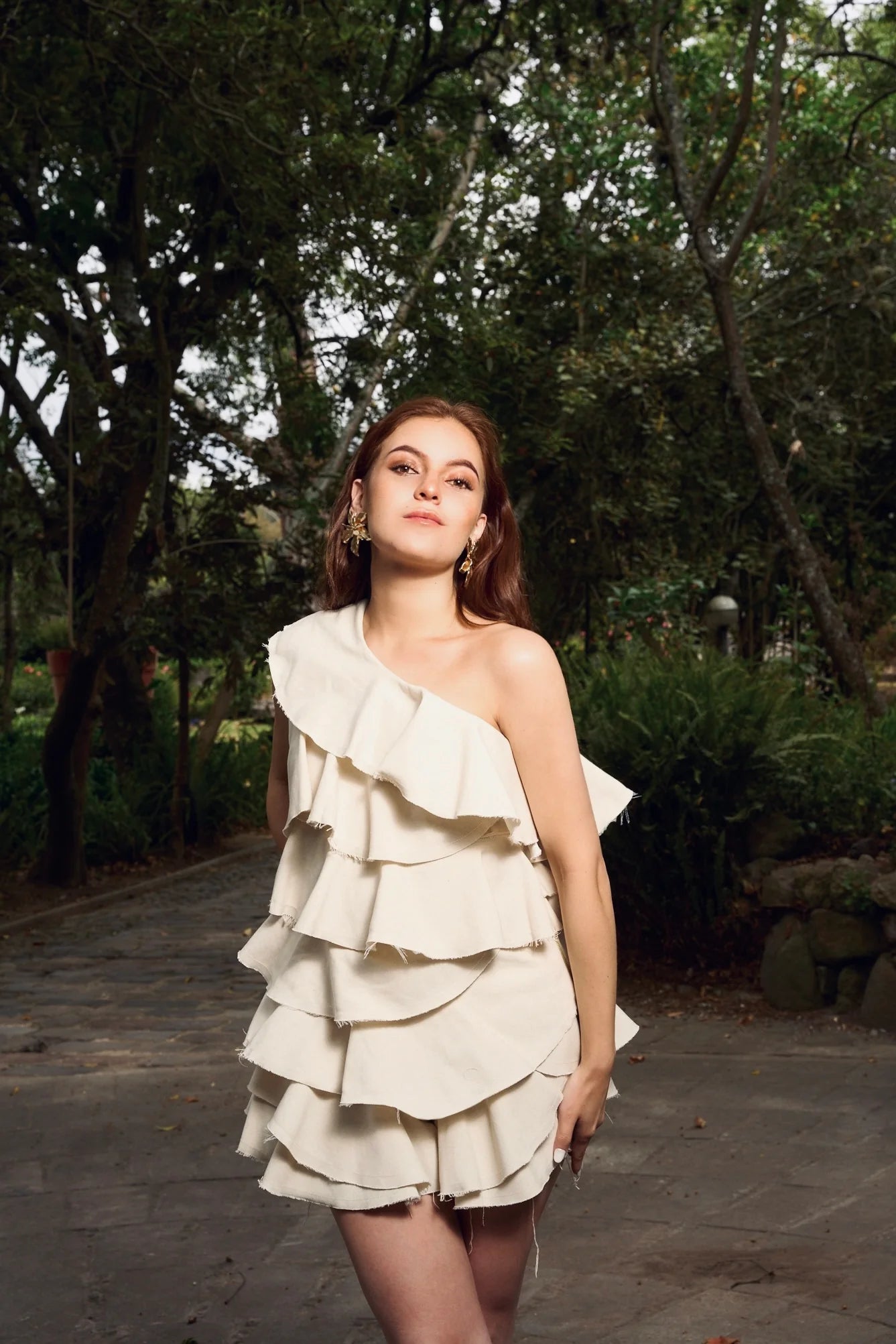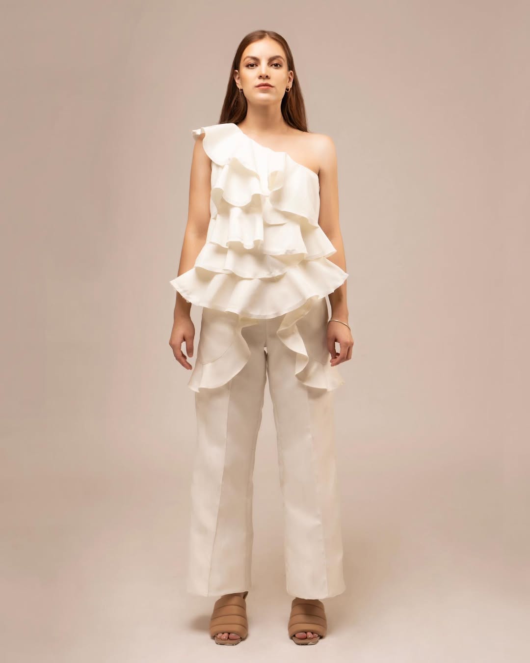 Esta blusa de un solo hombro es una pieza versátil hecha de tela crepé de alta calidad de Ecuador. Con un diseño moderno con volantes, agrega un toque de sofisticación a cualquier atuendo. Confeccionada con un ajuste cómodo y detalles elegantes, es perfecta para cualquier ocasión. Realza tu guardarropa con esta blusa imprescindible.