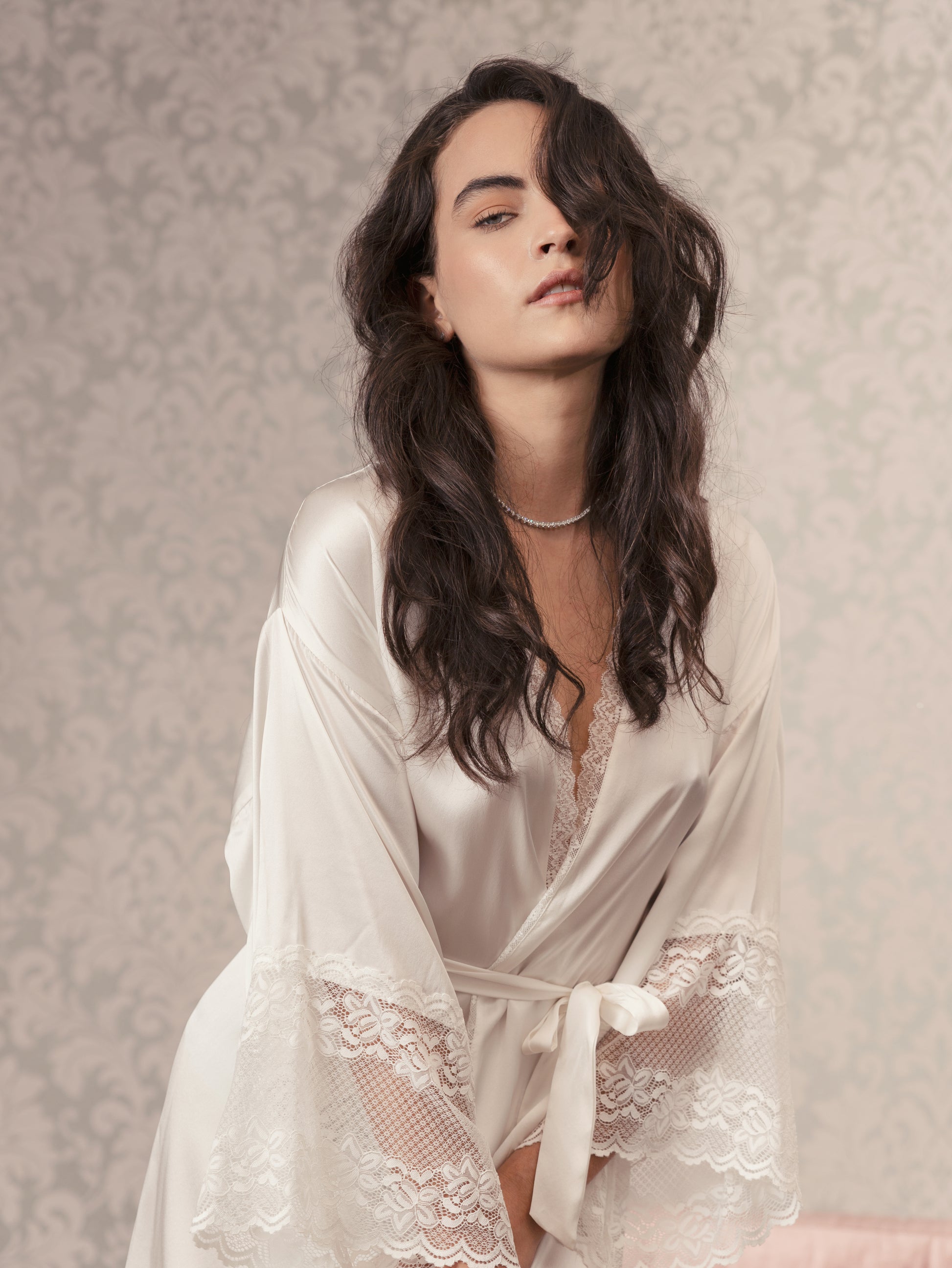 Mímate con nuestra divina bata de seda con detalles de encaje. Nunca te sentirás tan elegante como cuando uses nuestra bata Emilie