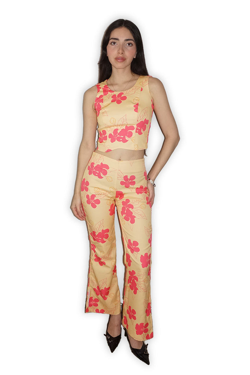 Presentamos el conjunto Florencia, la incorporación perfecta a tu guardarropa. Este hermoso conjunto de dos piezas presenta estampados de flores vibrantes que te harán destacar entre la multitud. Los pantalones también vienen con volantes en los costados, lo que te permite personalizar fácilmente el look. Mejora tu estilo con este conjunto versátil y elegante.