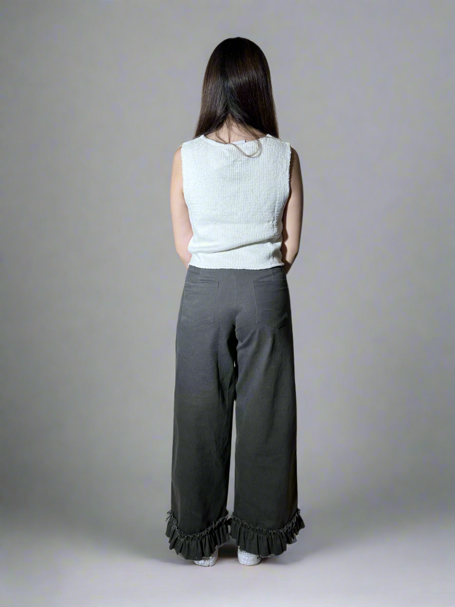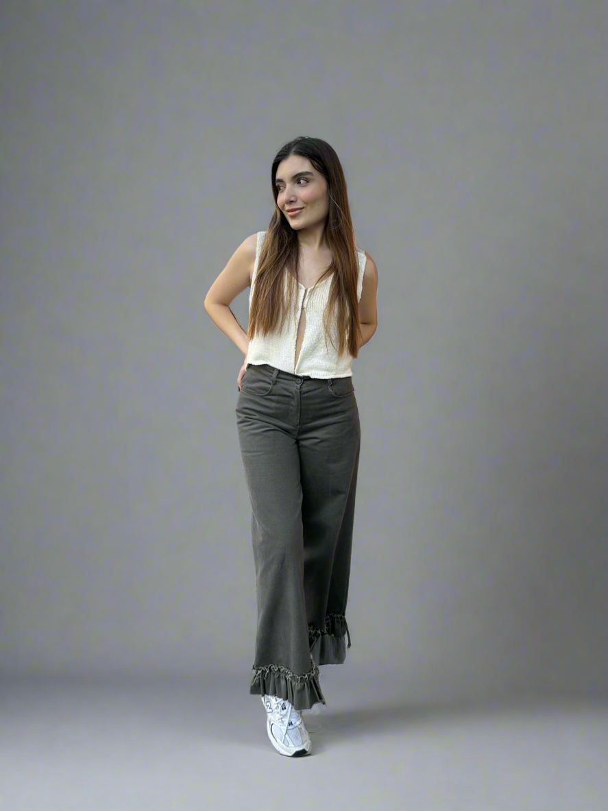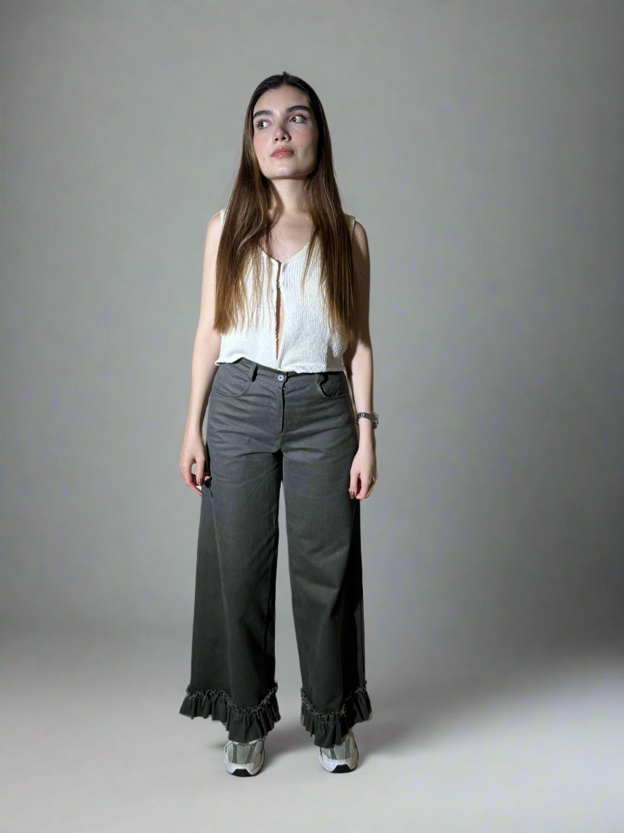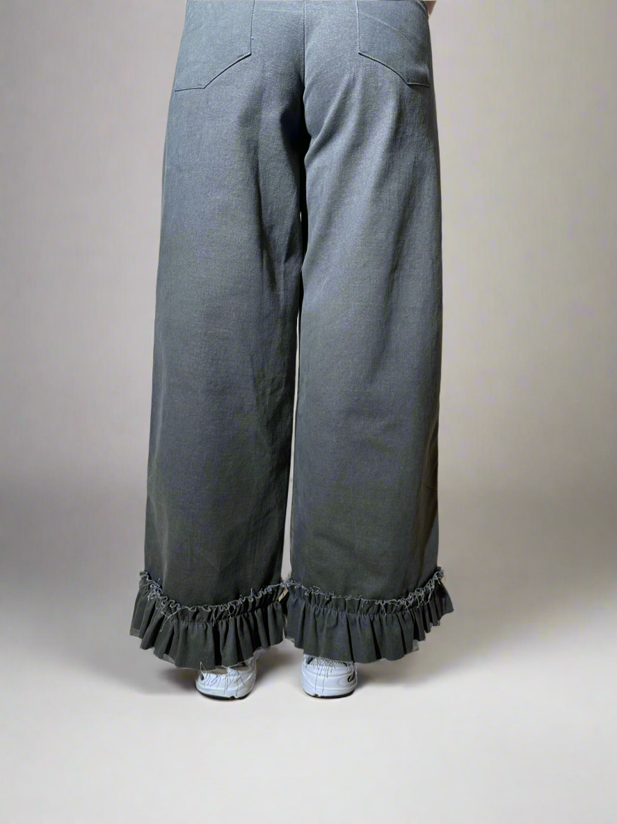 Elevate your style with our Gathered Jeans. Crafted with intricate details in neutral colors, these jeans feature a gathered design at the bottom for a touch of sophistication. Elevate your wardrobe with these exclusive and tasteful jeans.