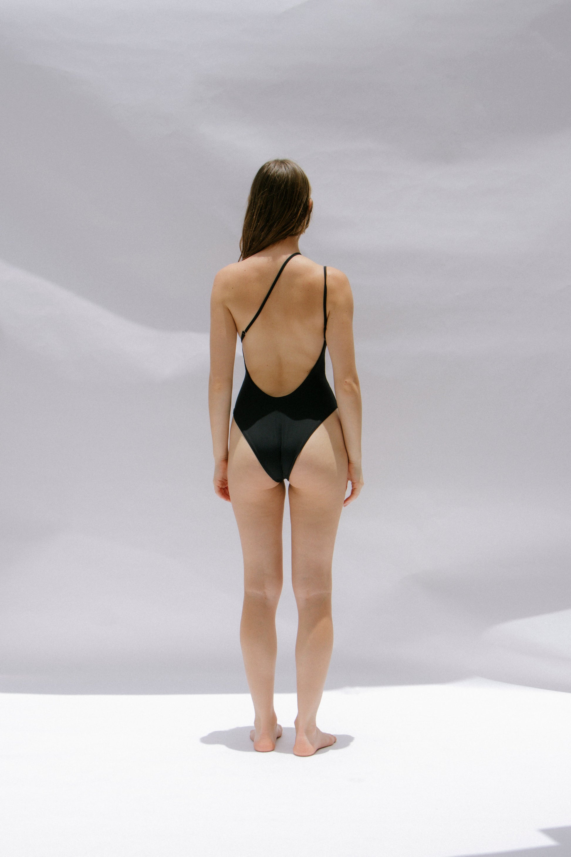 Traje de baño de un solo hombro, corte alto y escote profundo en la espalda. Los tirantes son ajustables y todo el interior está forrado.