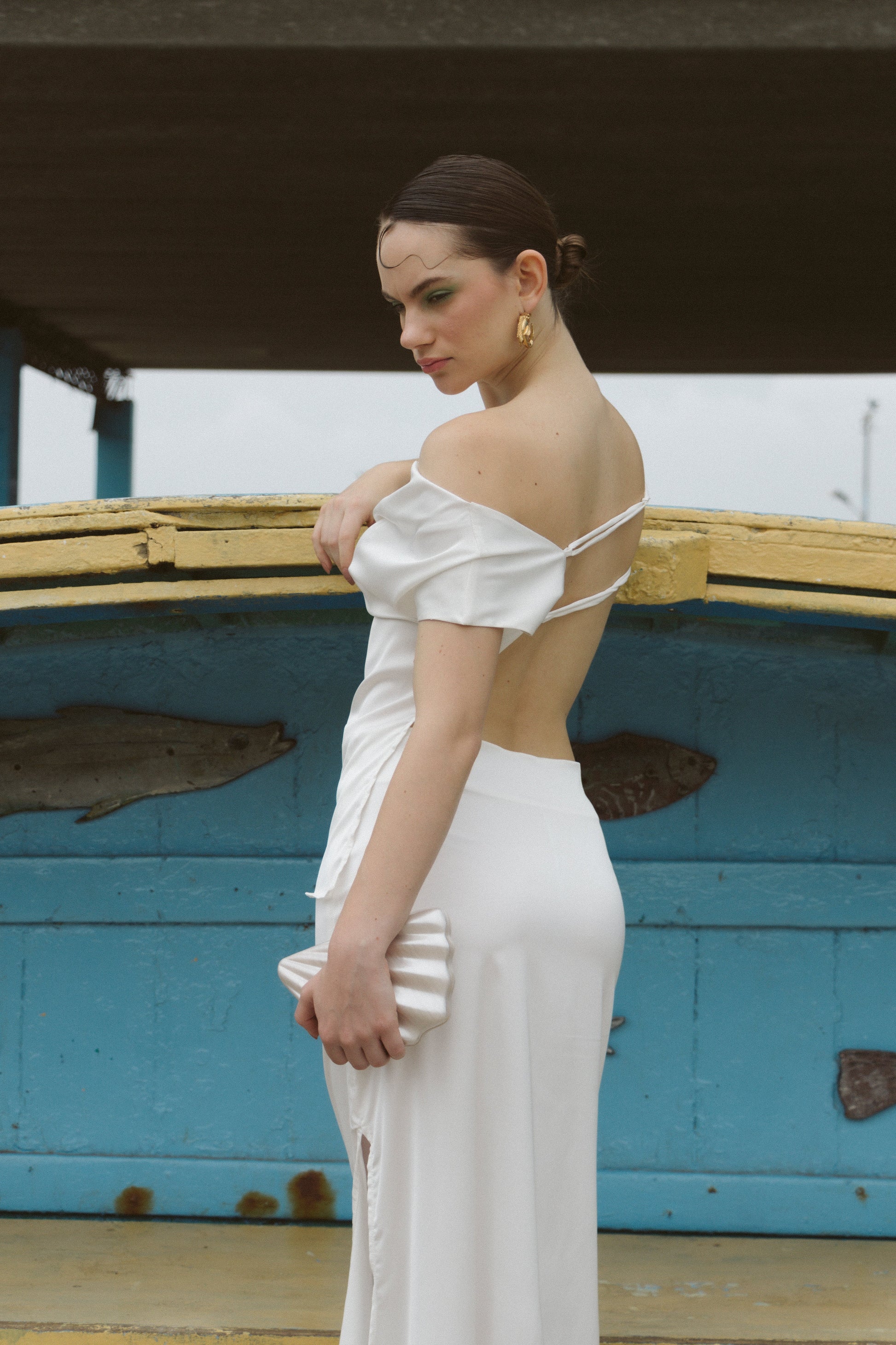 Blusa de satén, asimétrica. Lleva el escote delantero drapeado y/o fuera del hombro. Los tirantes de la espalda son regulables.