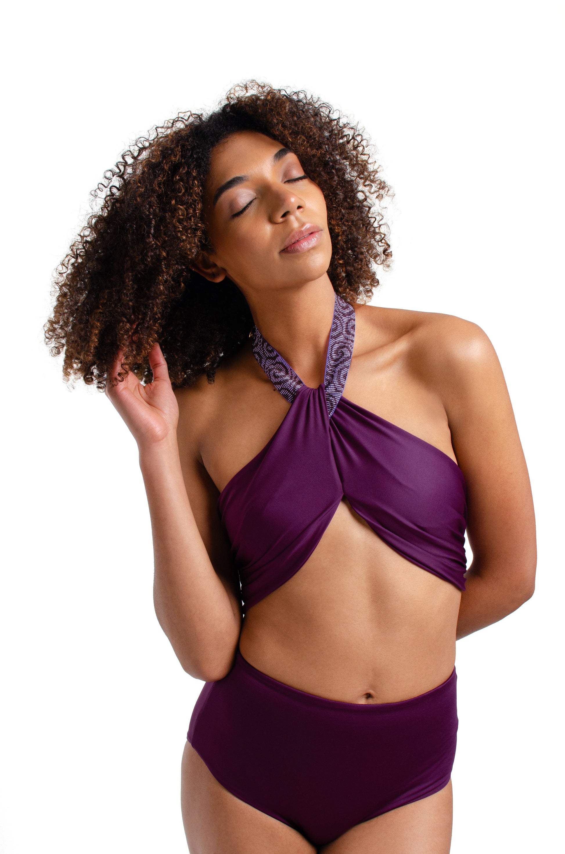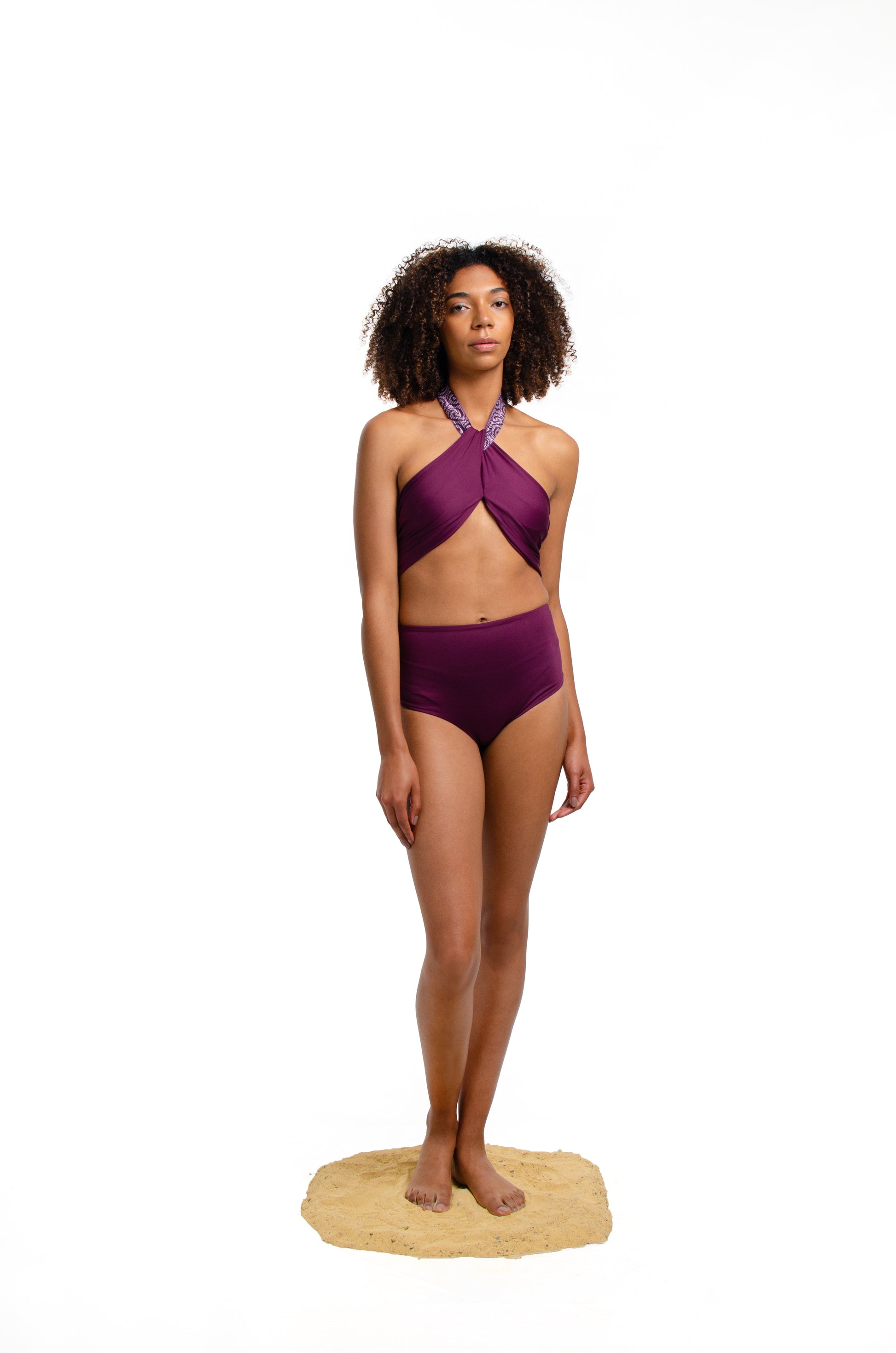 Halter style top tied at the neck. This top includes the Seashell necklace which is adjustable with a bow. The necklace is removable and it was hand-woven by local artisans in Colombia.