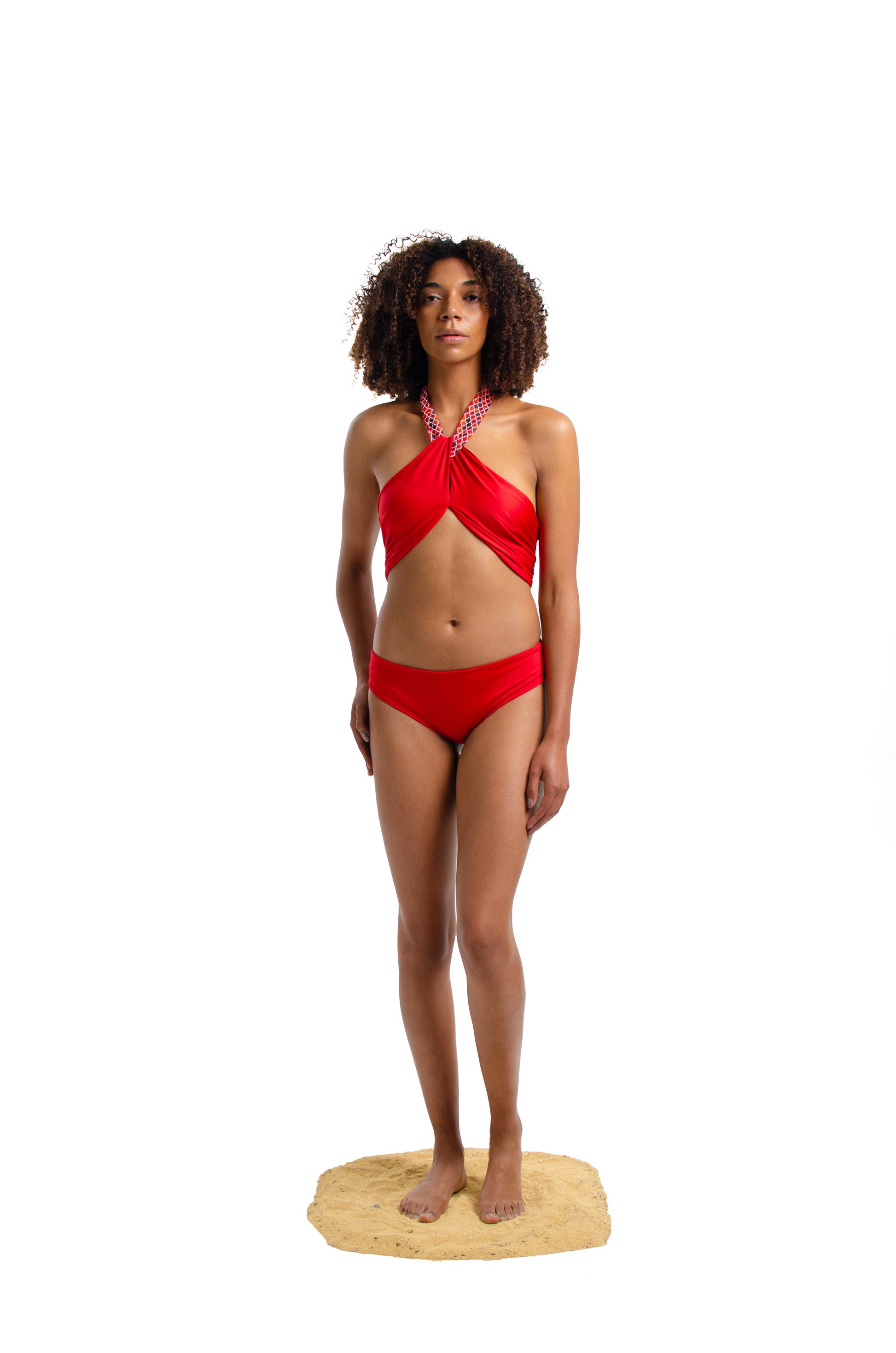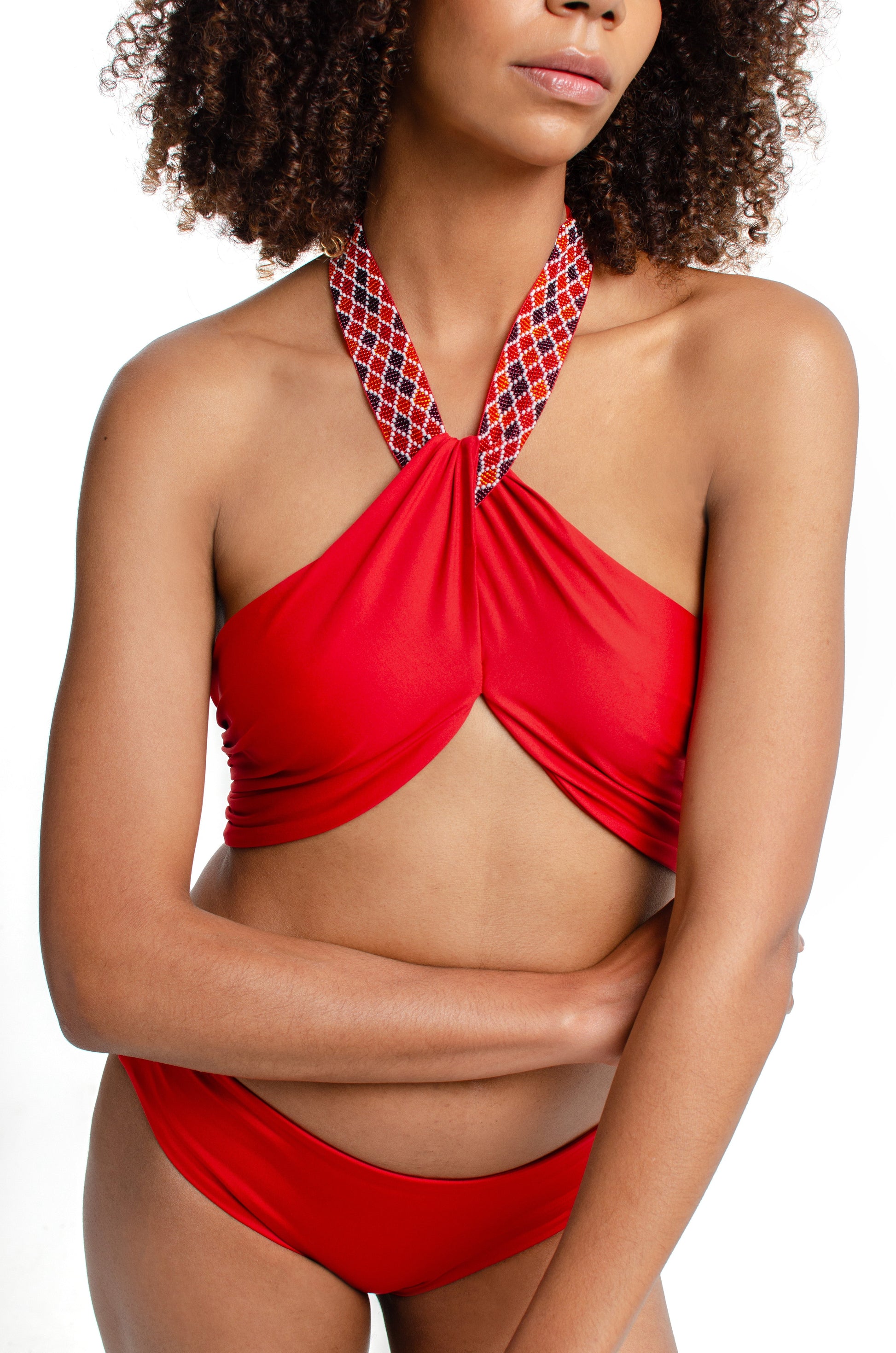 Halter style top tied at the neck. This top includes the Luzca necklace which is adjustable with a bow. The necklace is removable and it was hand-woven by local artisans in Colombia.