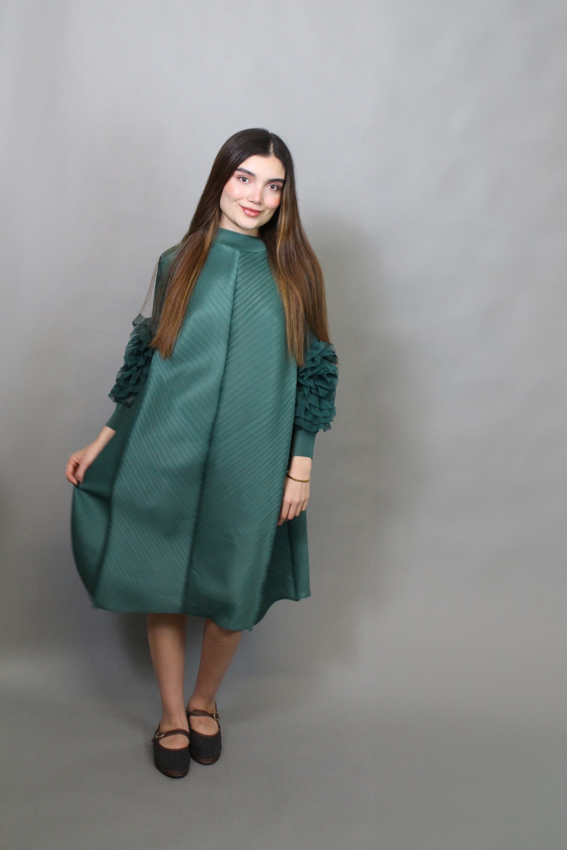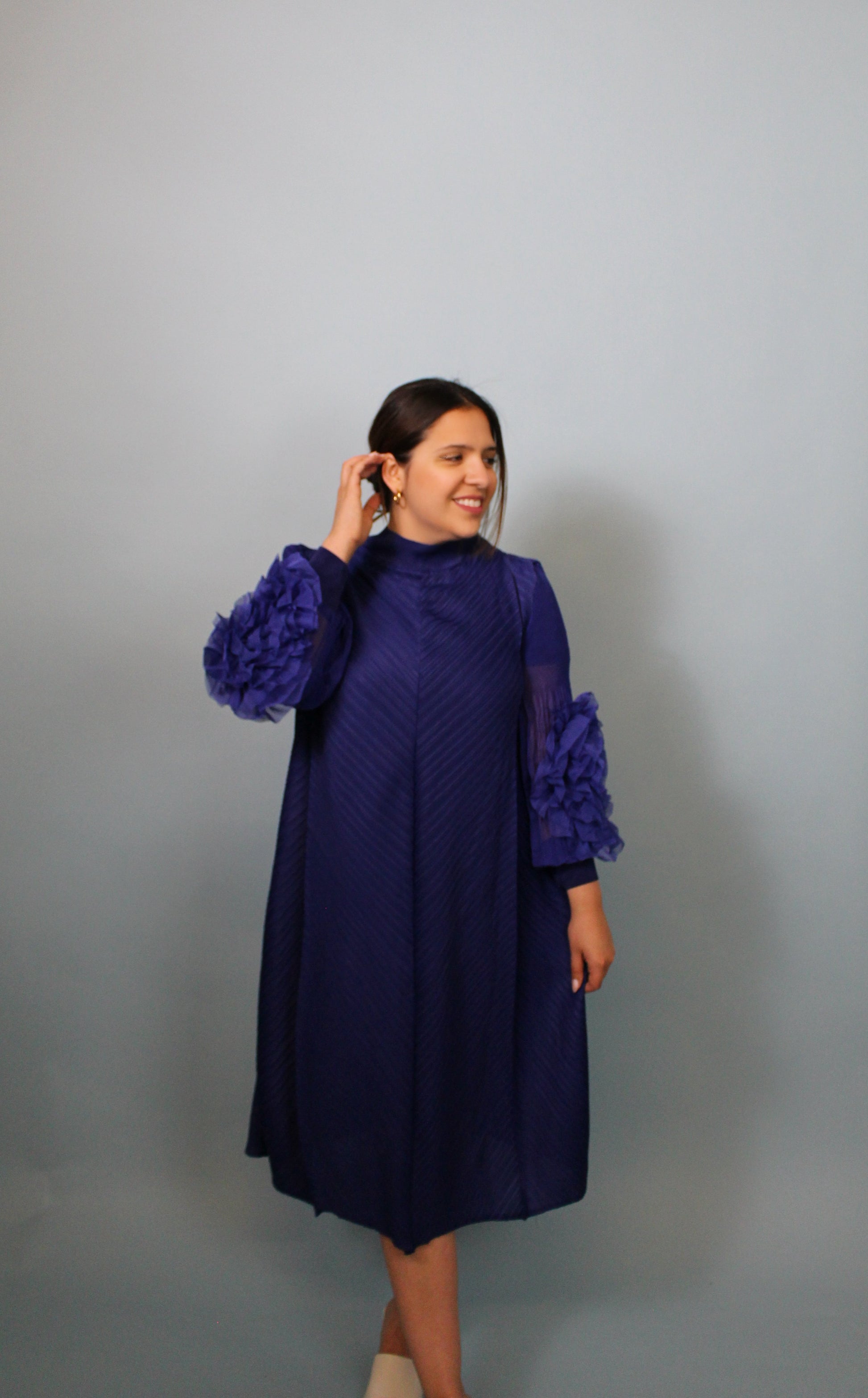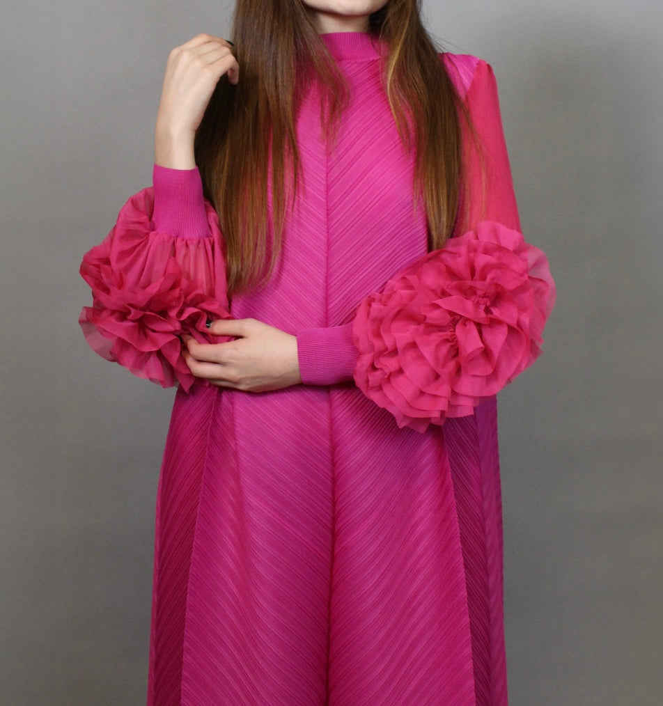 Indulge luxuriously with our Pleated Holiday Dress. Adorned in flower details, this dress is perfect for your holiday festivities. The flexible material makes it easy to wear for all body types. Elevate your style and make a statement with this must-have piece.