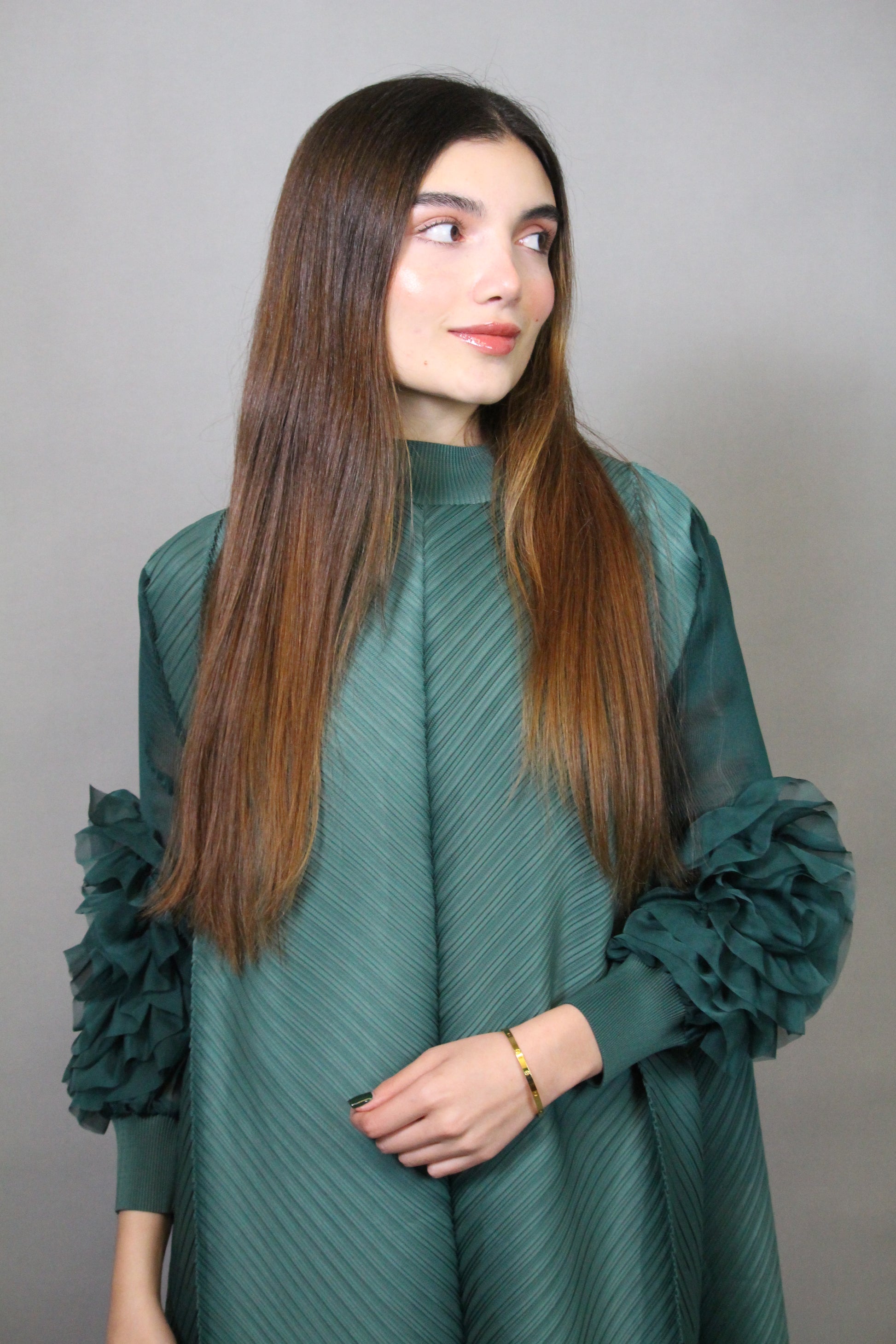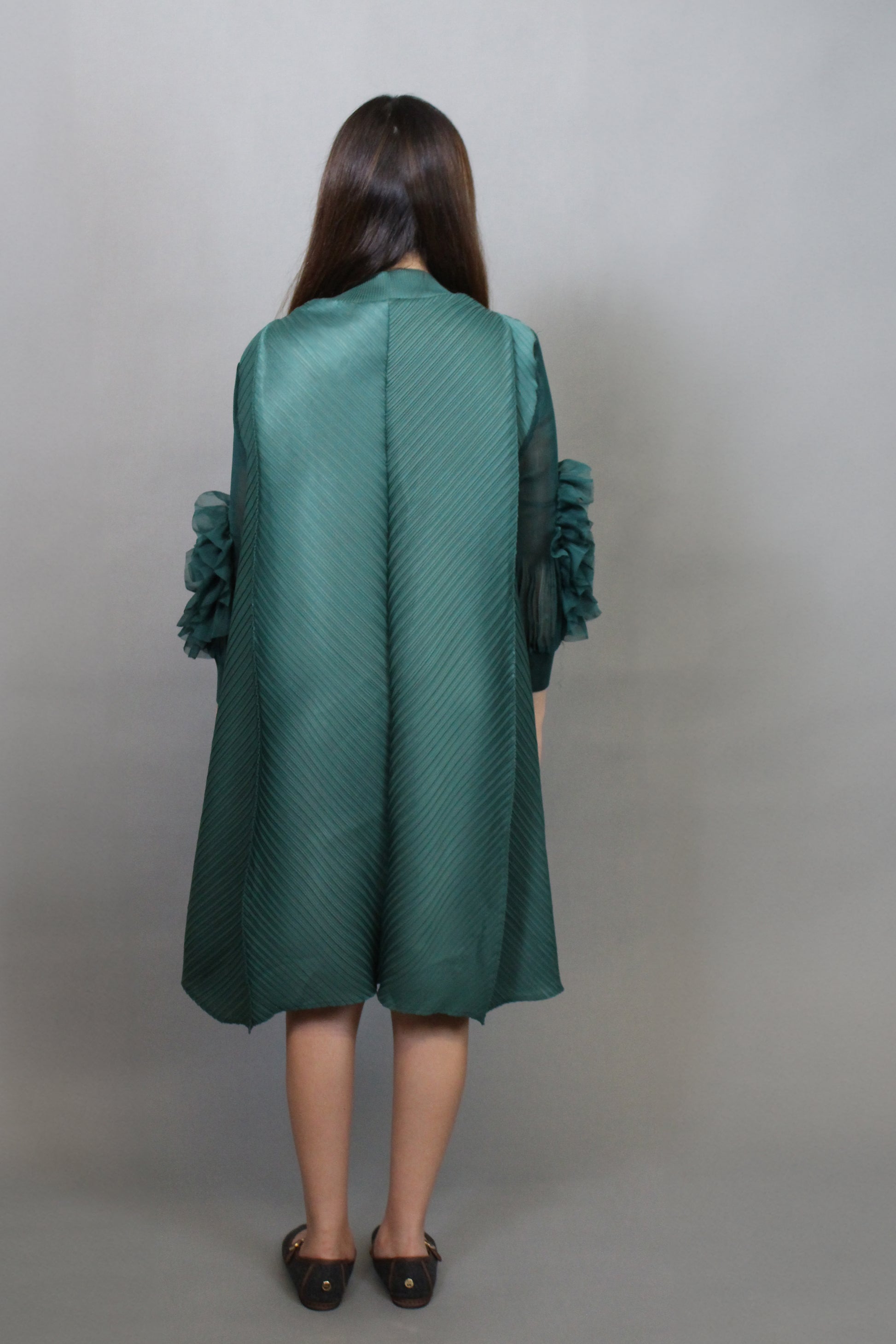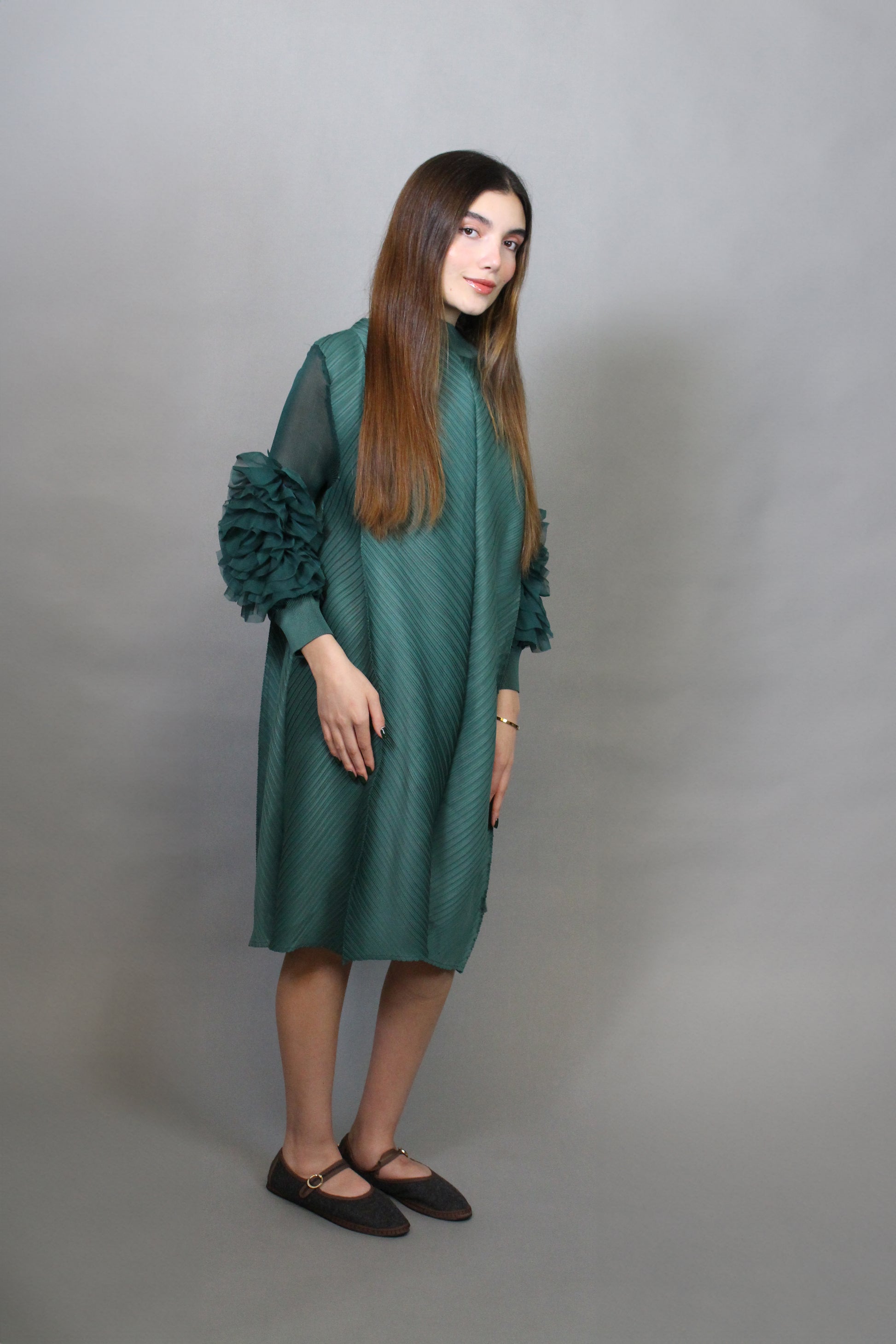 Indulge luxuriously with our Pleated Holiday Dress. Adorned in flower details, this dress is perfect for your holiday festivities. The flexible material makes it easy to wear for all body types. Elevate your style and make a statement with this must-have piece.