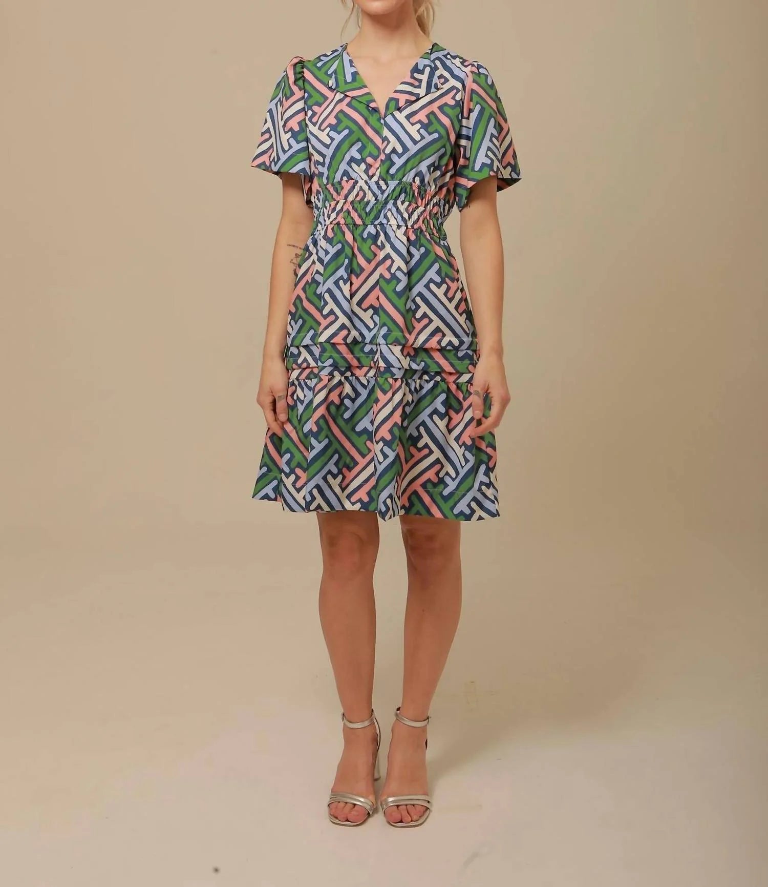 The Teresa Mini Dress by Lavi is a refined choice for warm-weather elegance. Featuring a vibrant geometric print in fresh greens, blues, pinks, and white, this short-sleeved dress highlights a flattering V-neckline and a smocked waist that contours the silhouette gracefully. The tiered skirt with a delicate ruffle adds subtle movement, while the easy pull-on design ensures effortless wear. Ideal for casual summer occasions, this dress combines comfort with sophisticated style. Hand wash recommended to maintain its vibrant colors and shape.