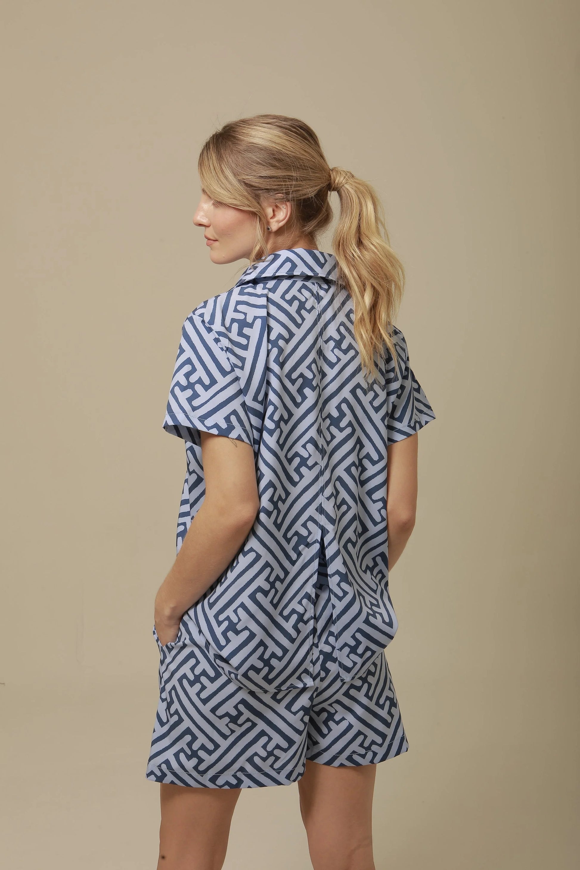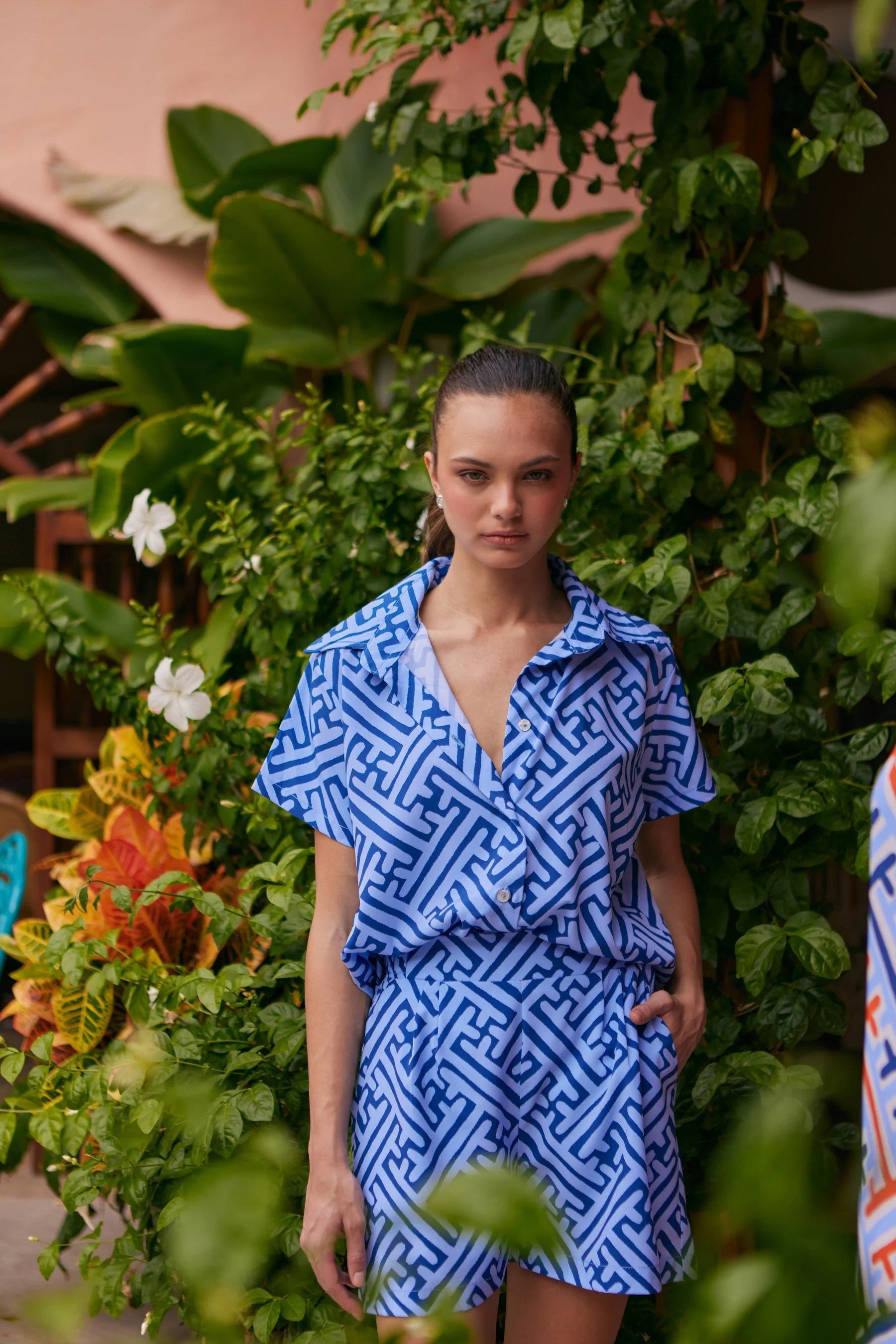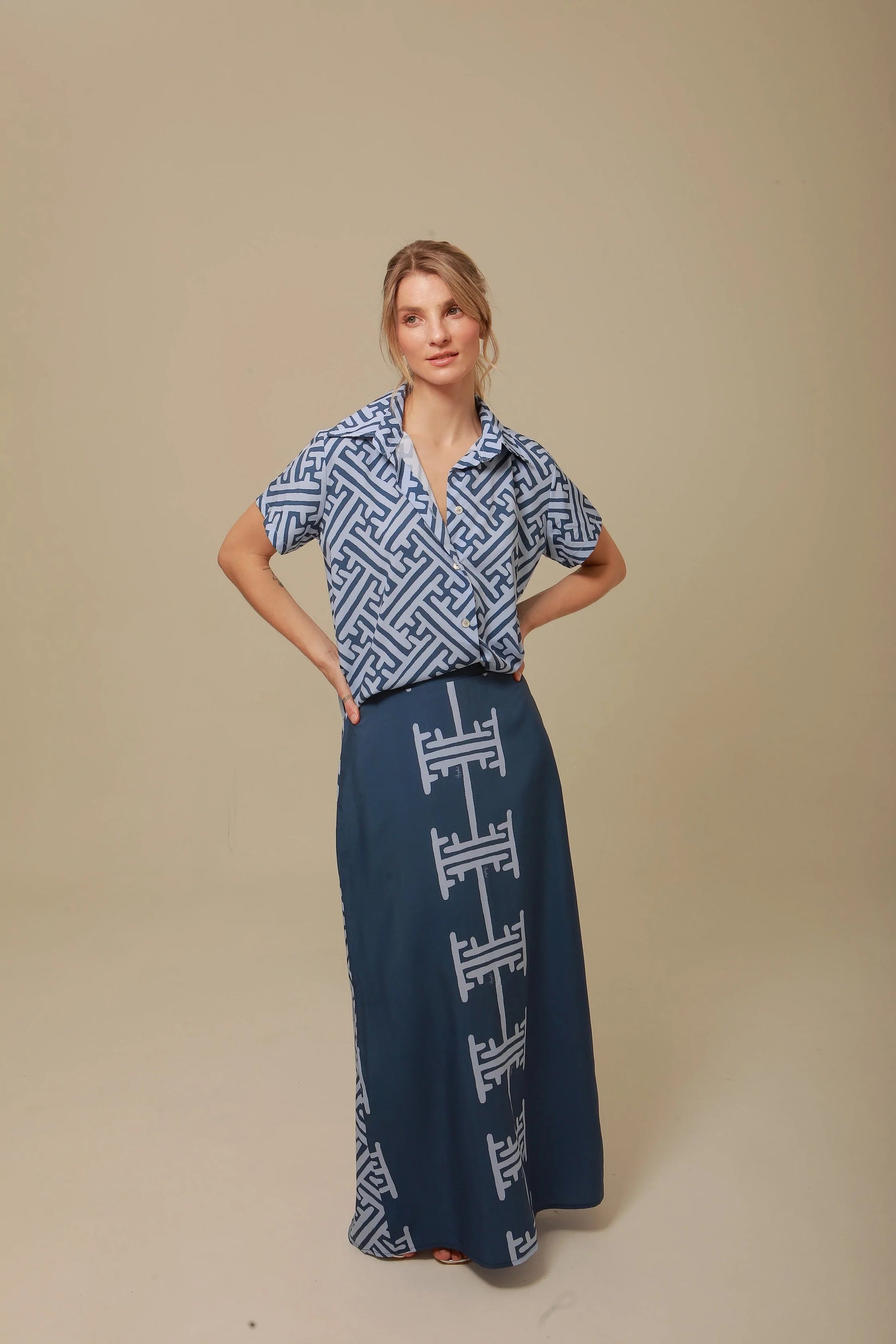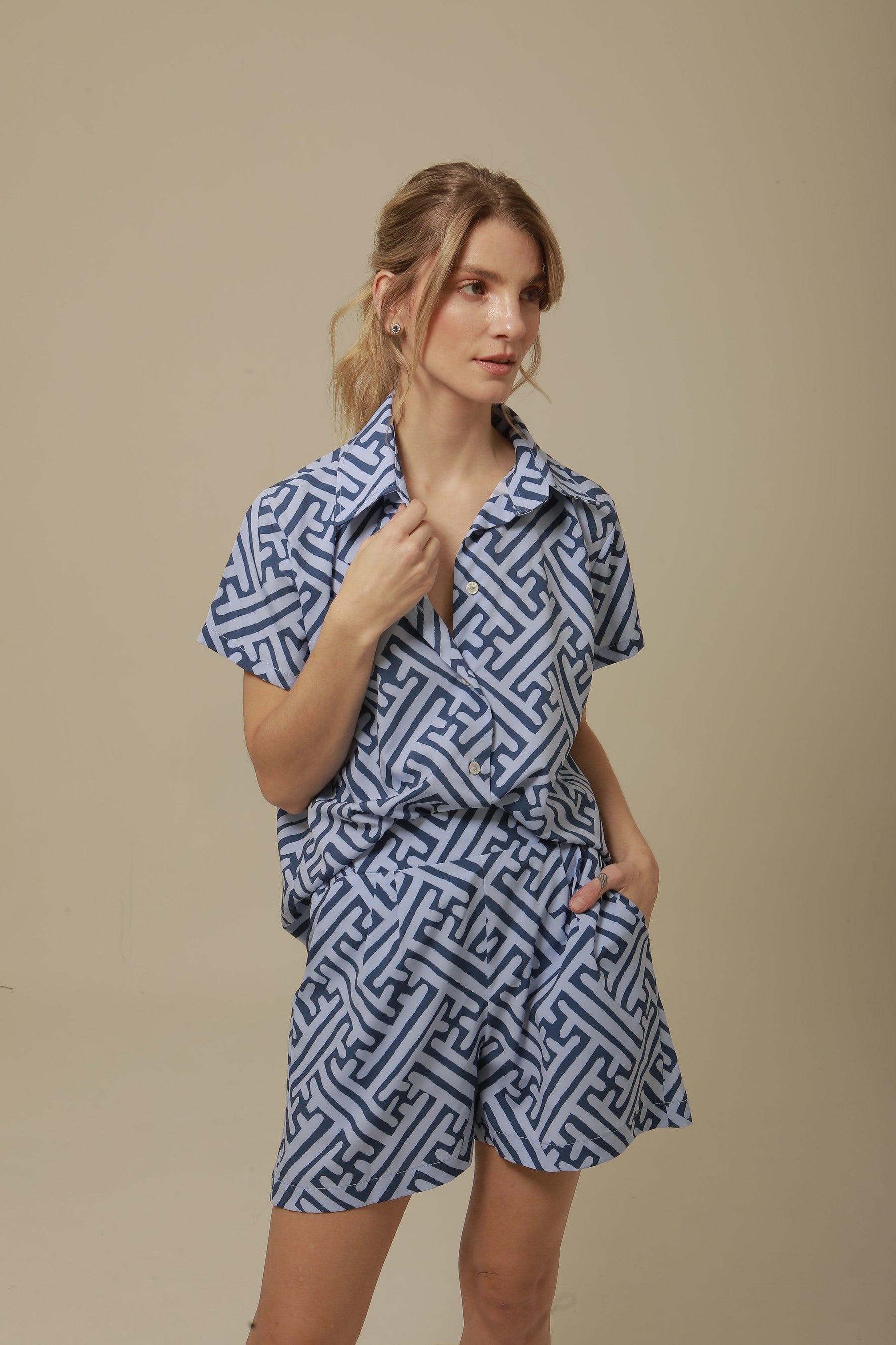 Introducing the Toledo Shirt Blue - the perfect combination of style and sustainability. Made from eco-polyester material, this beautiful restore wear shirt features stunning blue prints that can be mixed and matched with your favorite pants or skirts. Add a touch of elegance to your wardrobe while reducing your environmental impact.