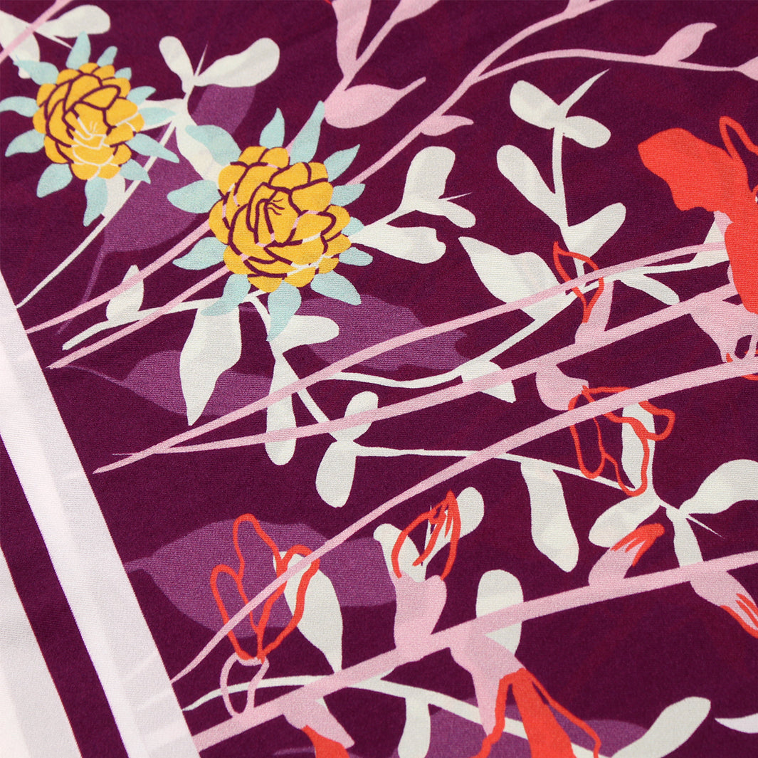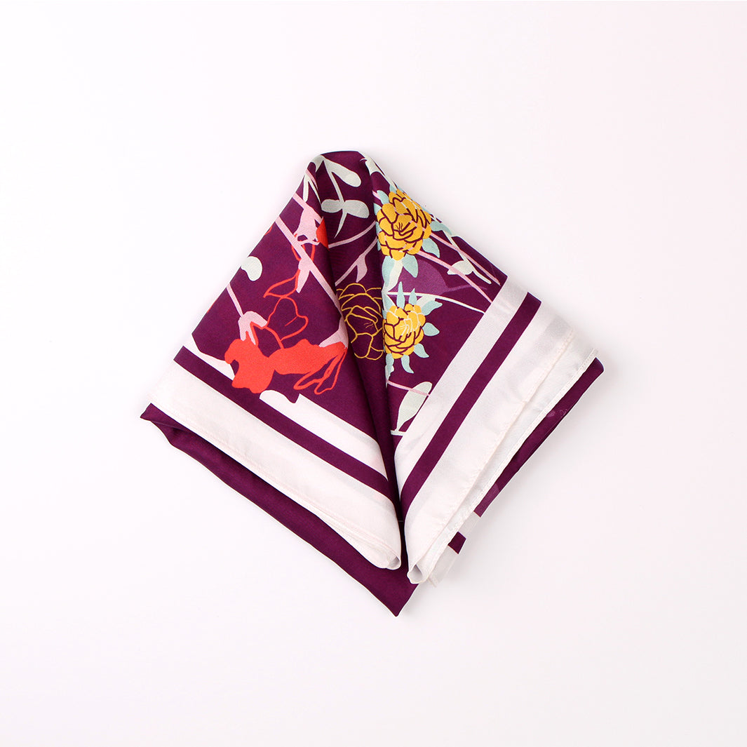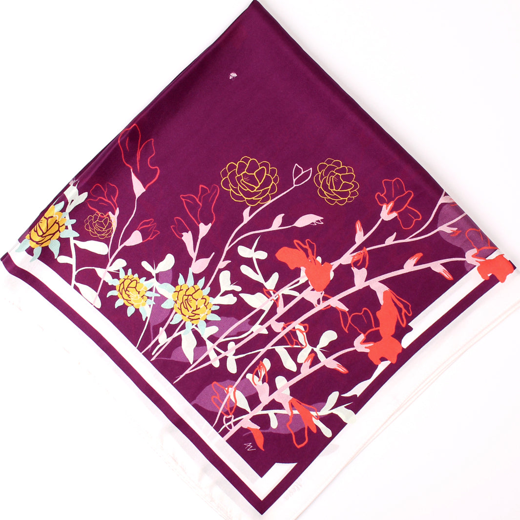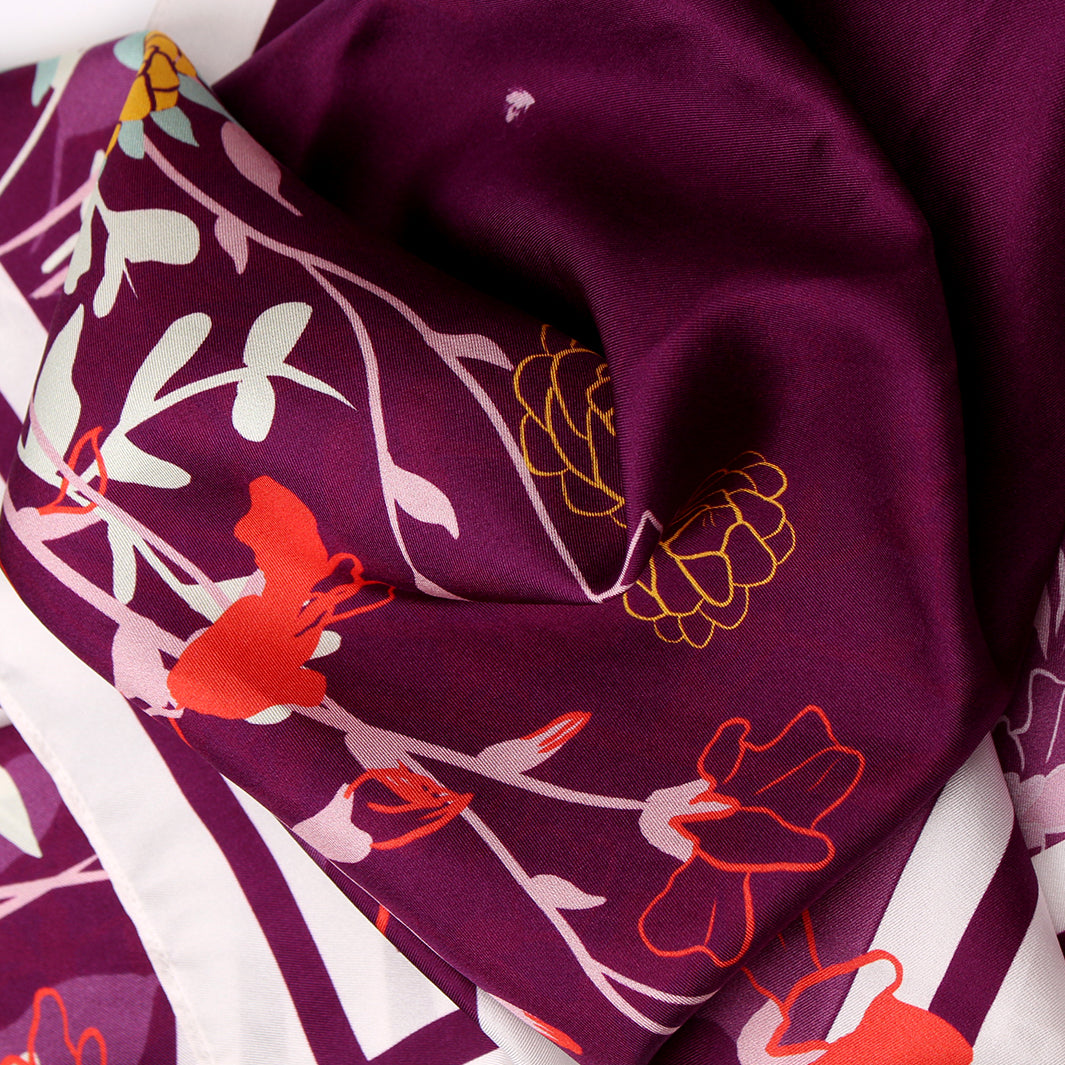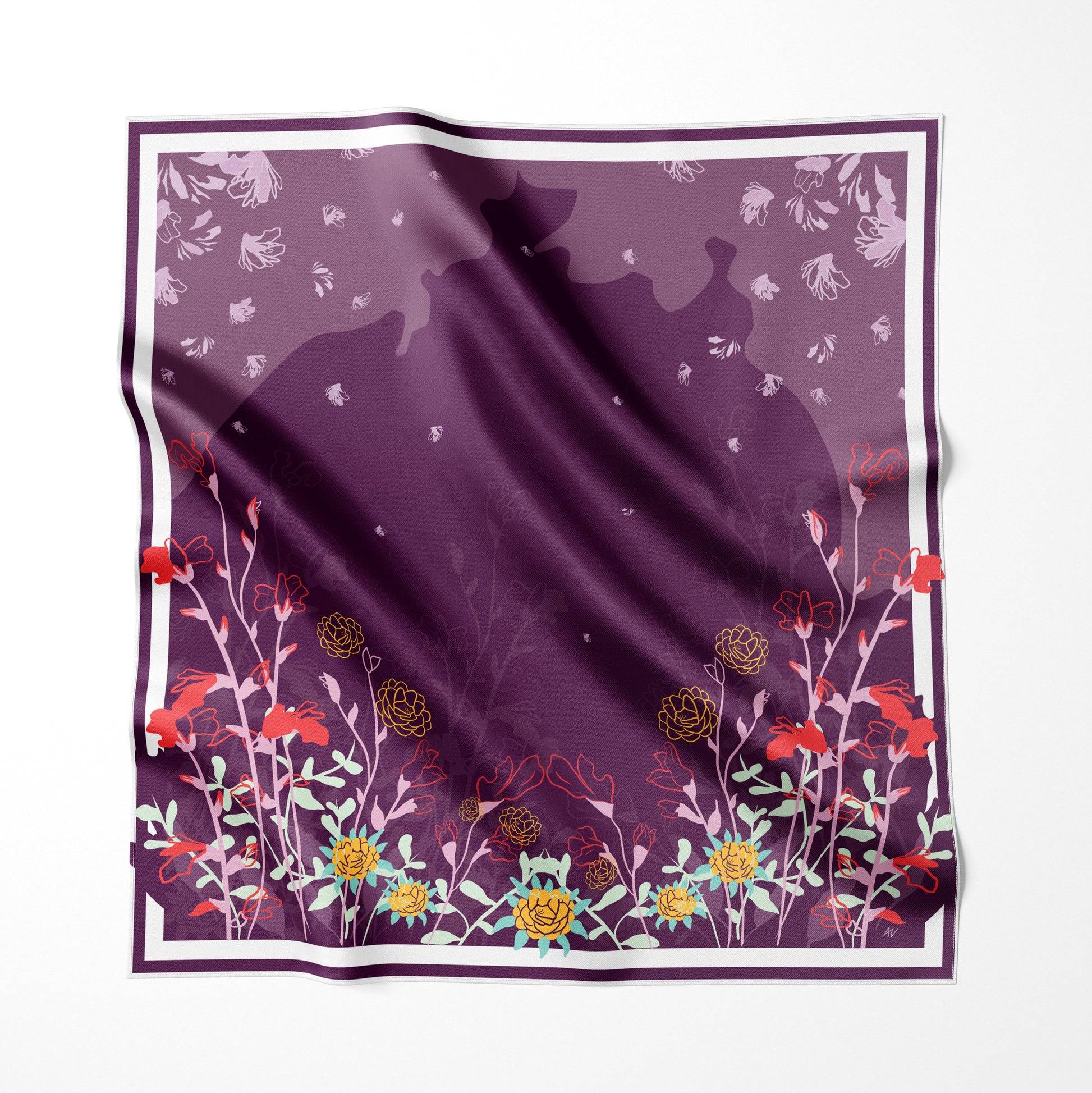 Bufanda en seda hecha a mano con diseño Valencia Purple. 100% Seda, Ilustrada a Mano por Alesia Nava.