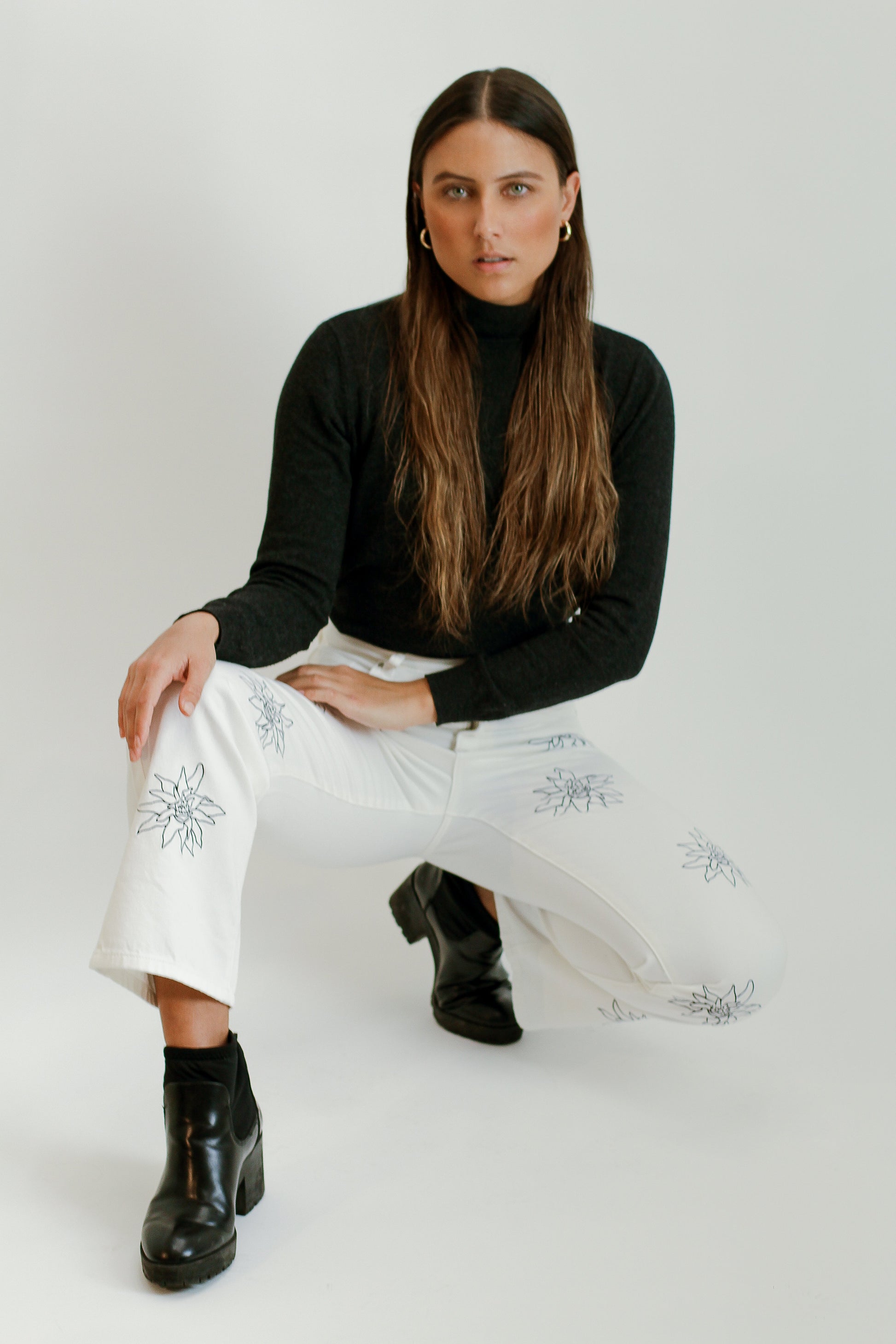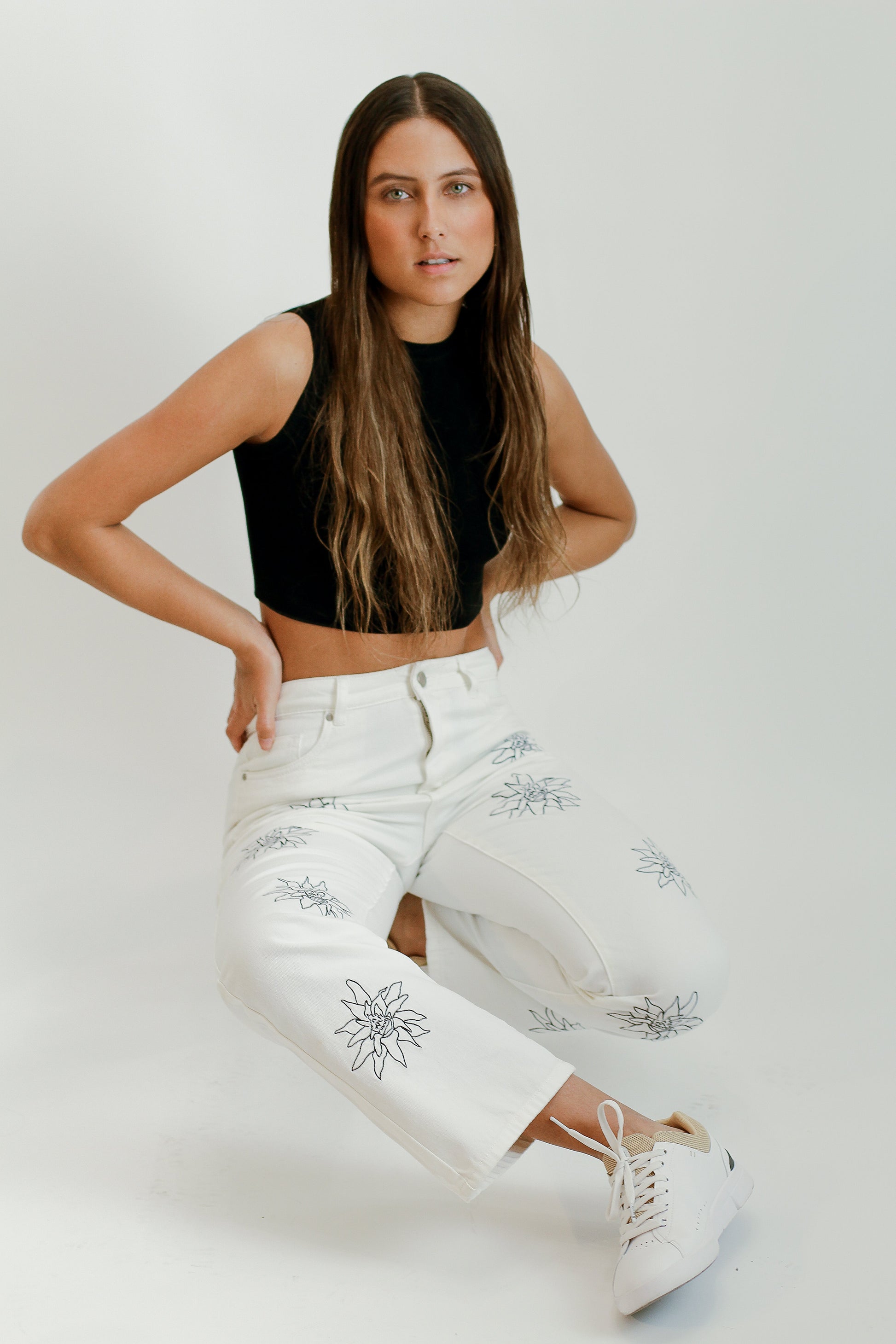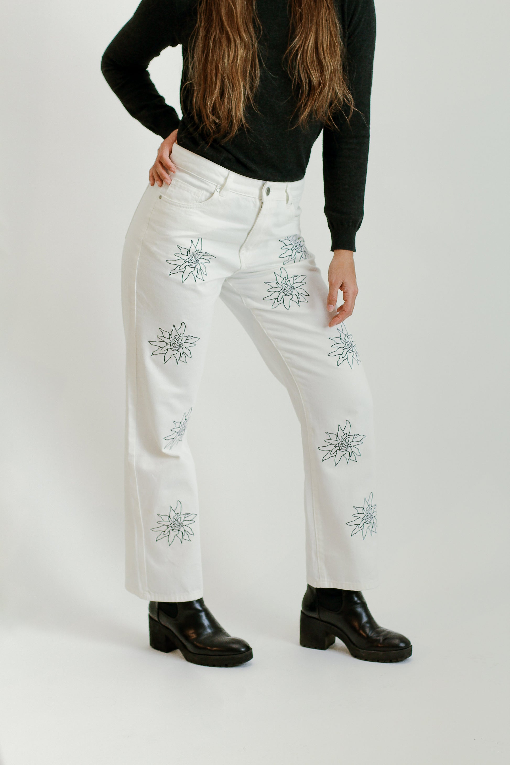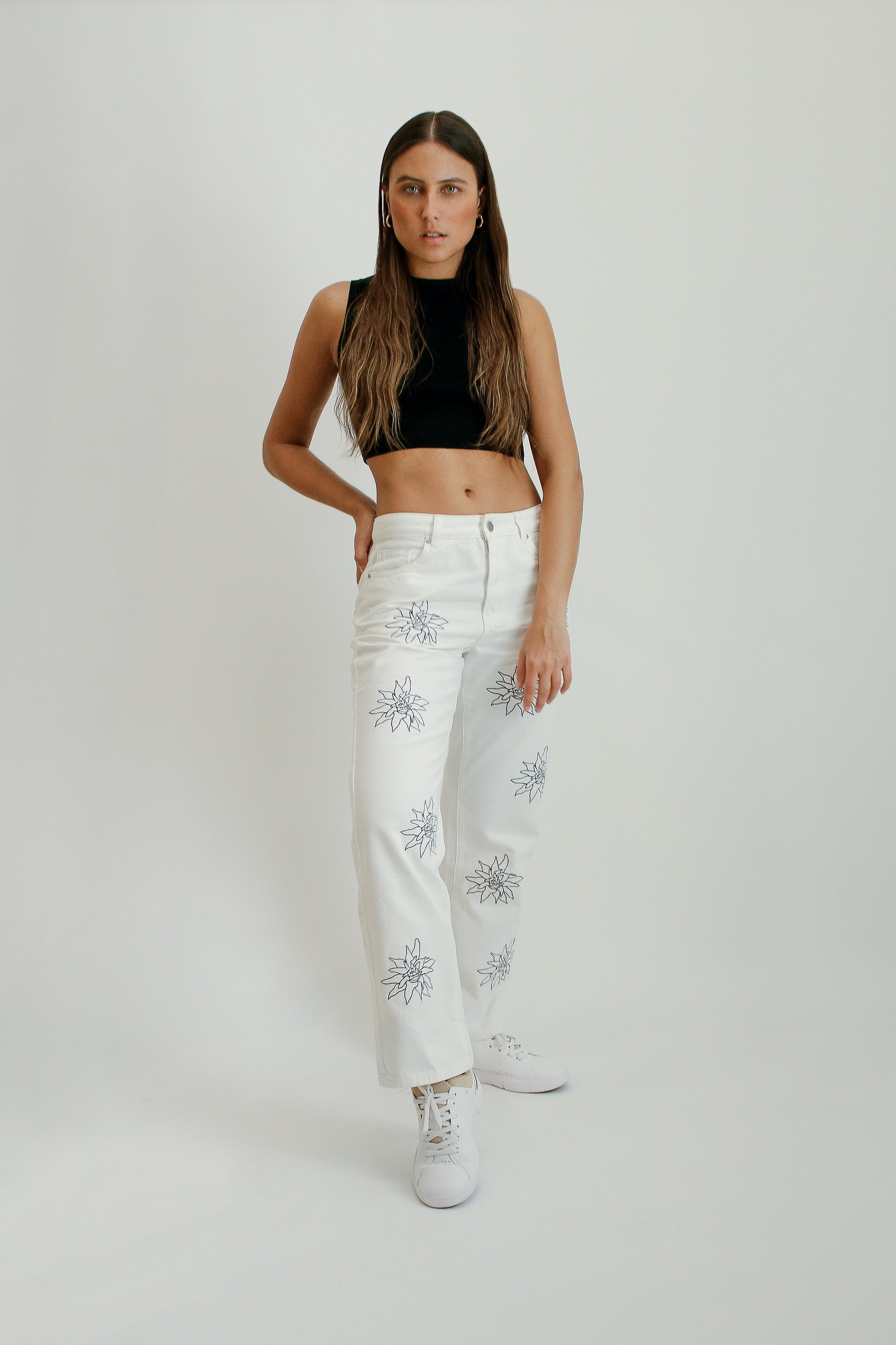 Este jean está hecho 100 % de algodón y tiene bordado el logotipo de la marca en forma de flor. Tiene un corte hasta la mitad de la cintura y la parte inferior de la pierna es ancha. Se puede combinar de muchas maneras y según el clima. Combínalo con zapatillas, botas o tacones.