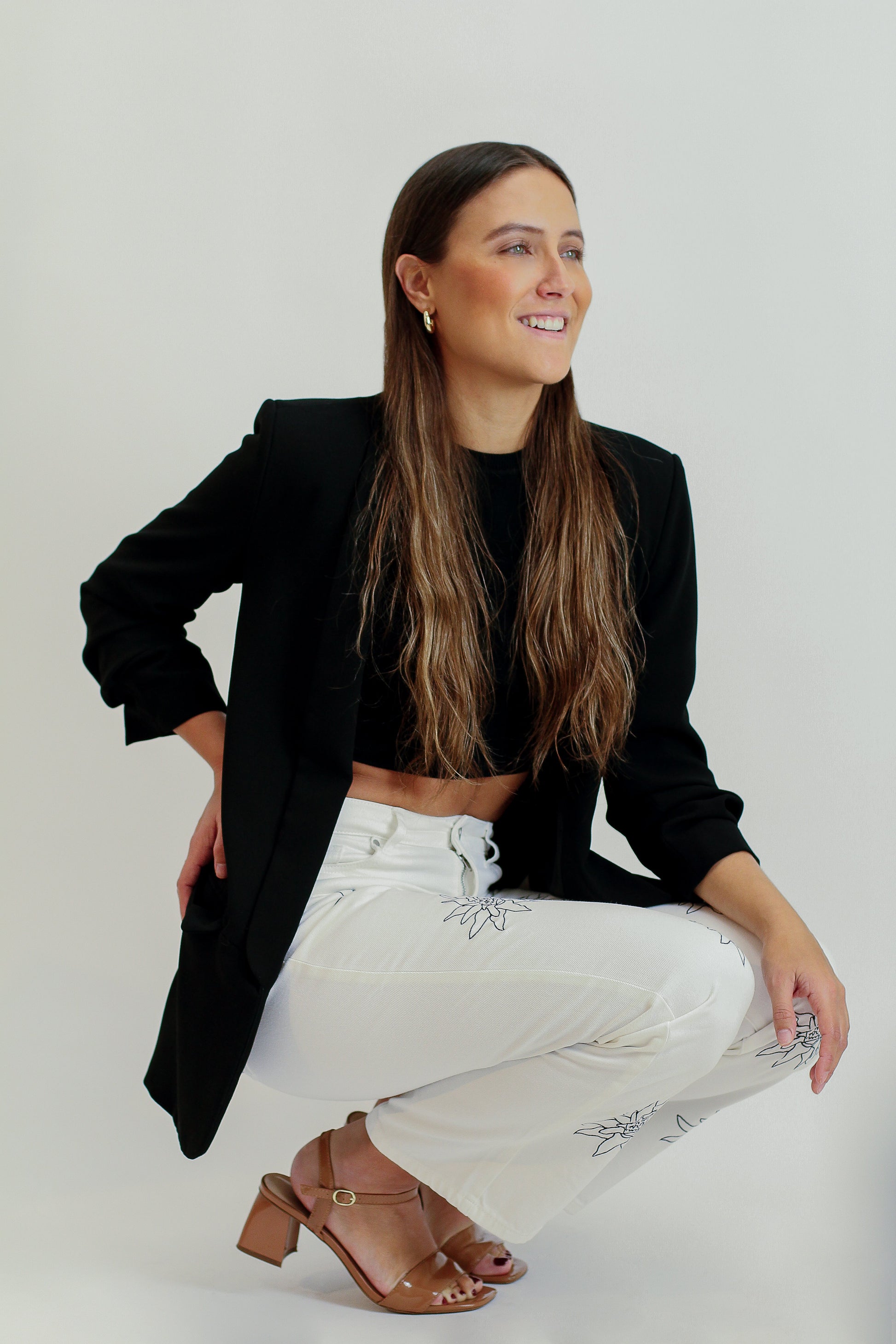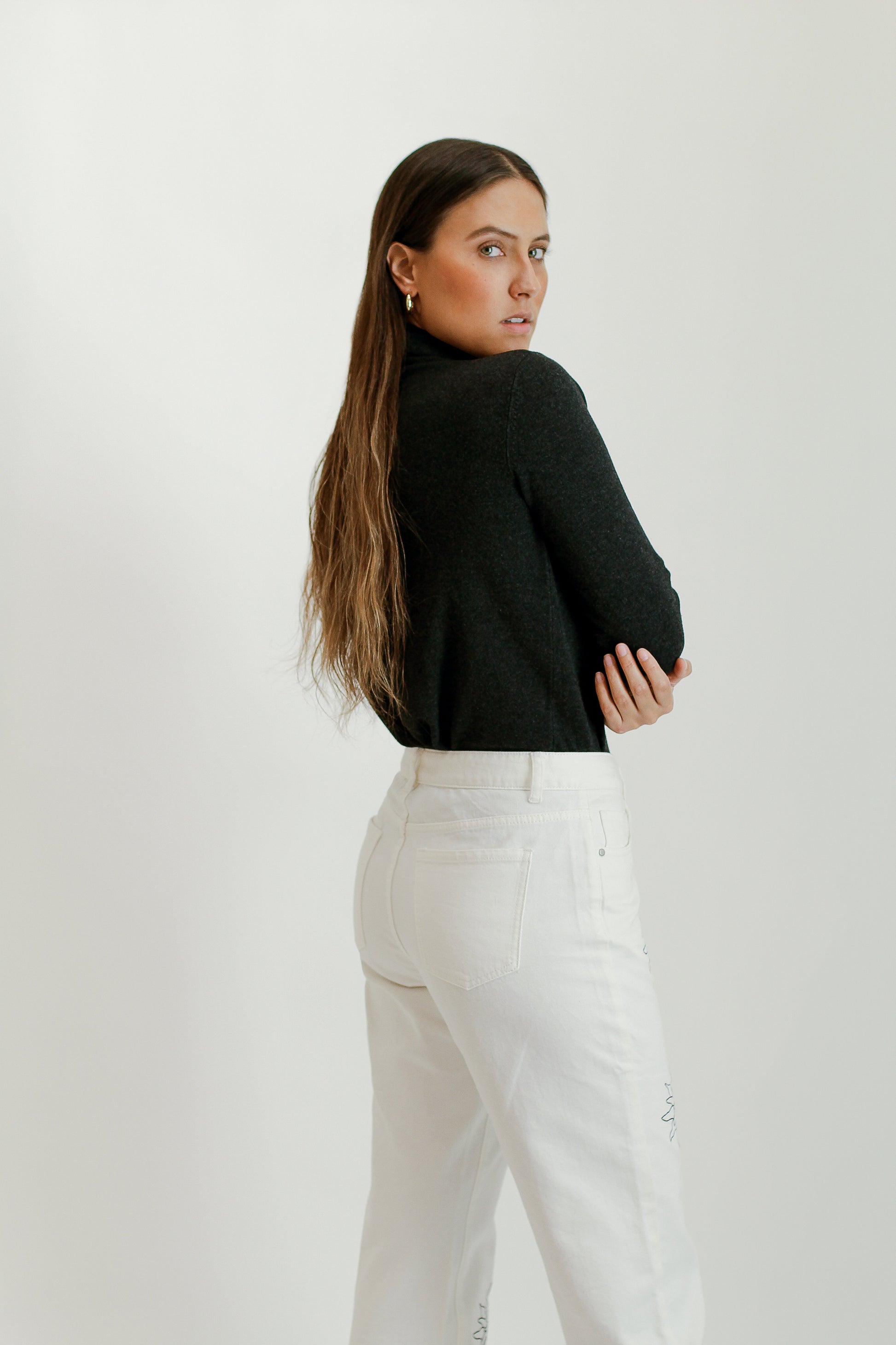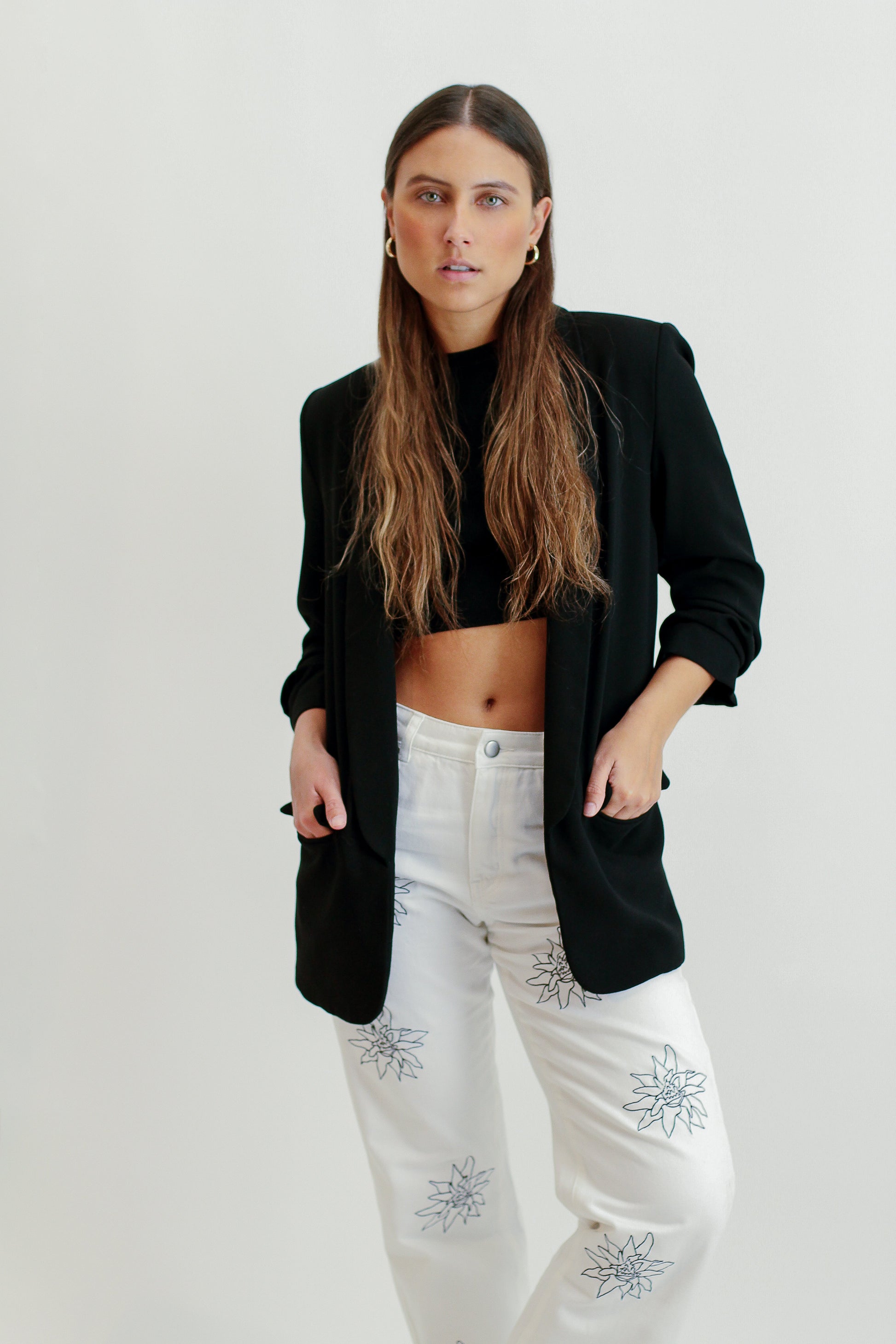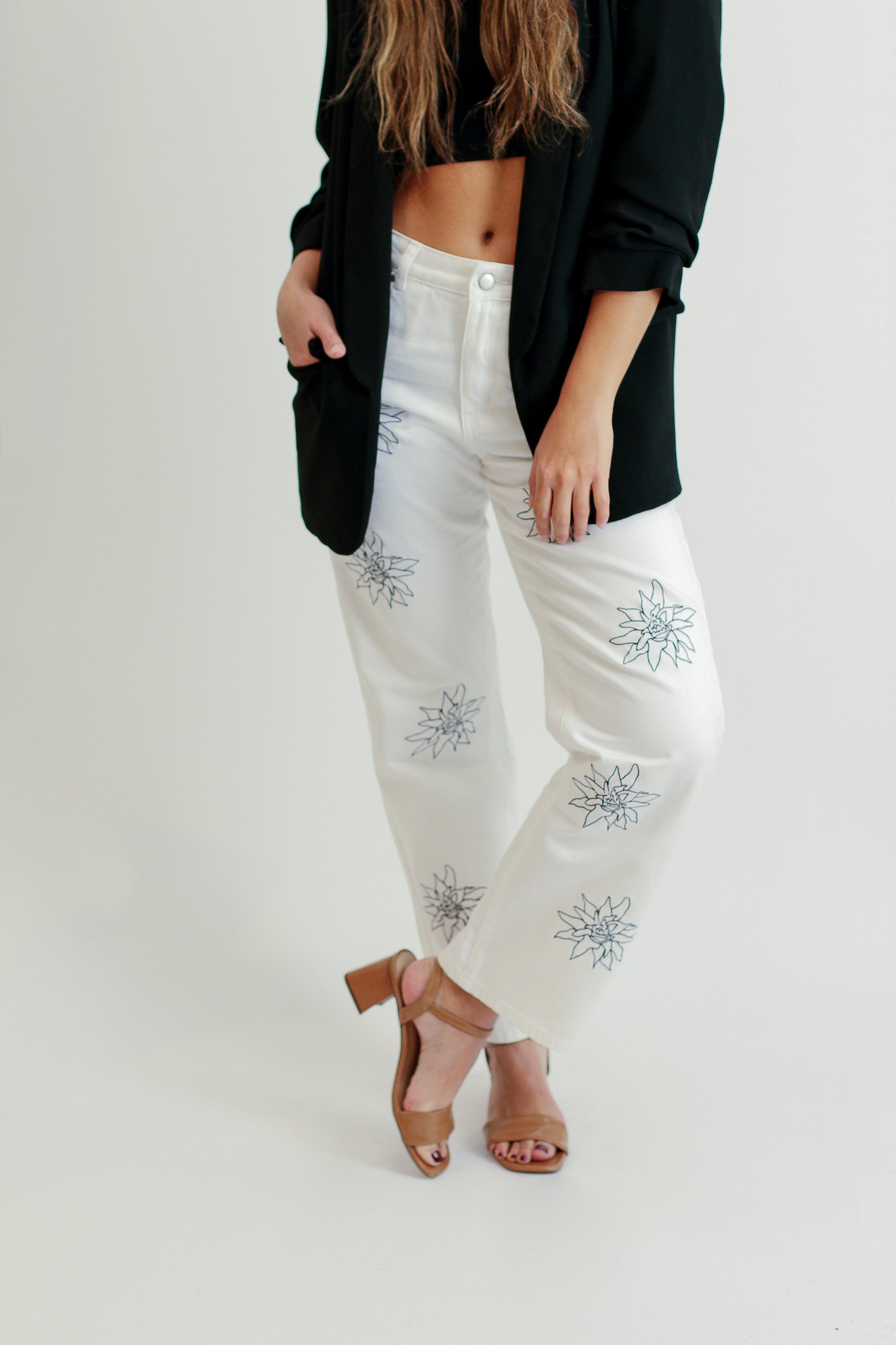 Este jean está hecho 100 % de algodón y tiene bordado el logotipo de la marca en forma de flor. Tiene un corte hasta la mitad de la cintura y la parte inferior de la pierna es ancha. Se puede combinar de muchas maneras y según el clima. Combínalo con zapatillas, botas o tacones.