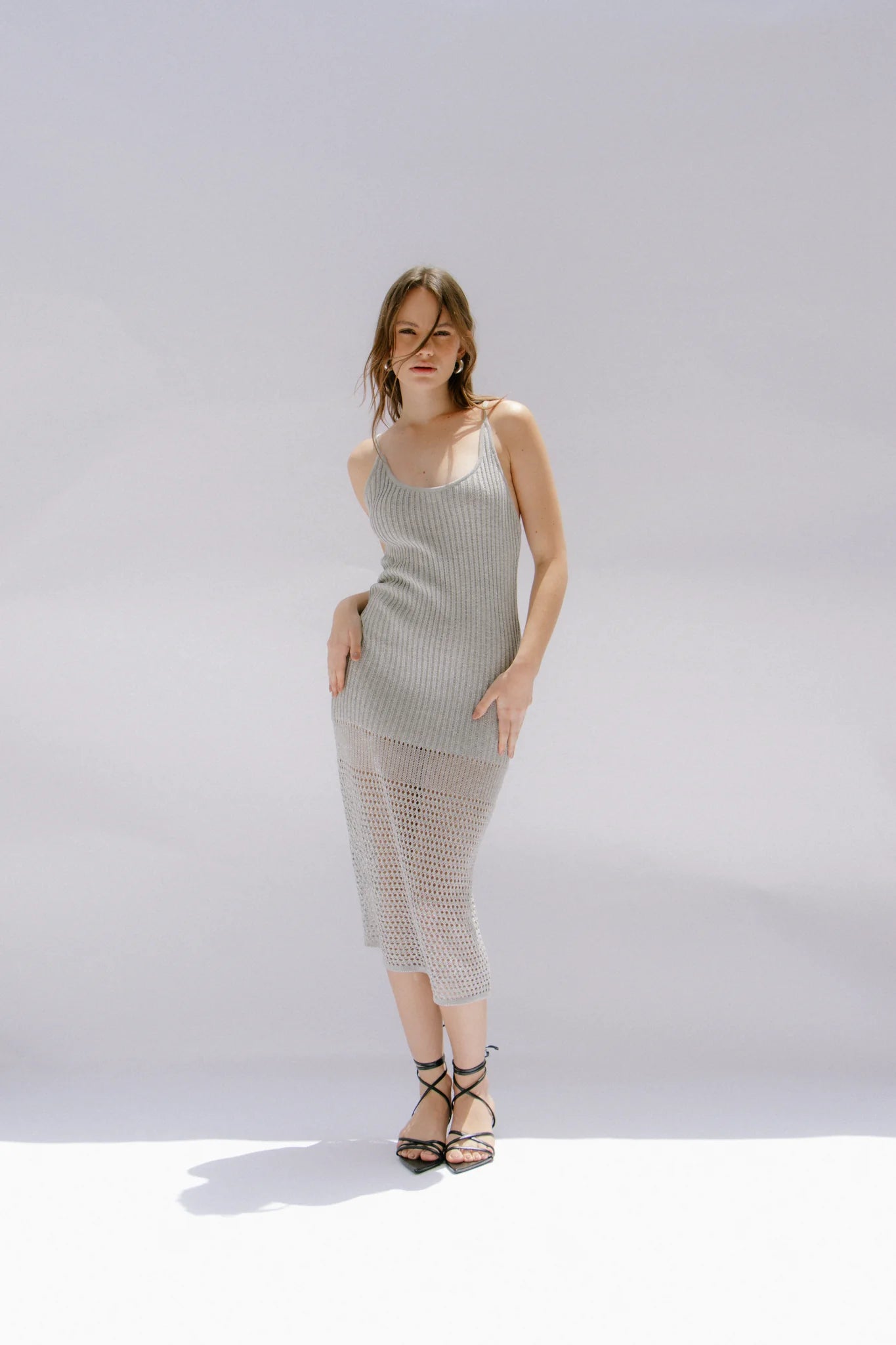 Sleeveless knit dress, with open fabric detail at the waist.
