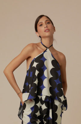 This sleeveless top, delicately tied at the neck, makes the perfect addition to any elegant wardrobe. Made from luxurious cotton with a beautiful blueprint, it exudes sophistication and style. A must-have for those who appreciate timeless fashion and refined taste.
