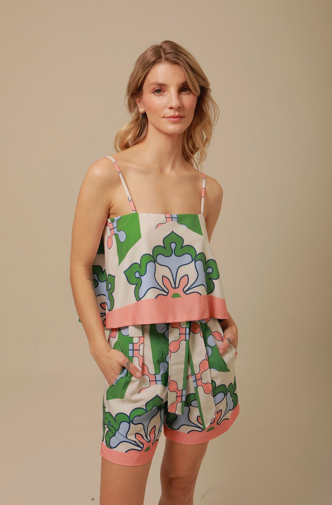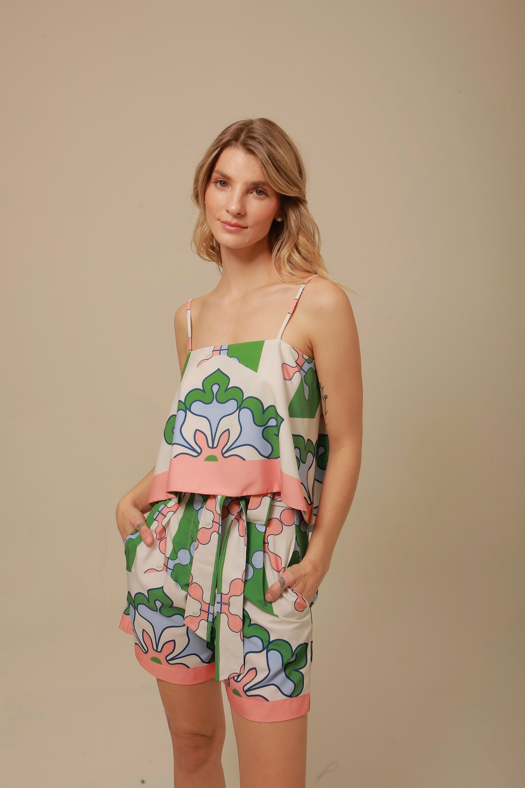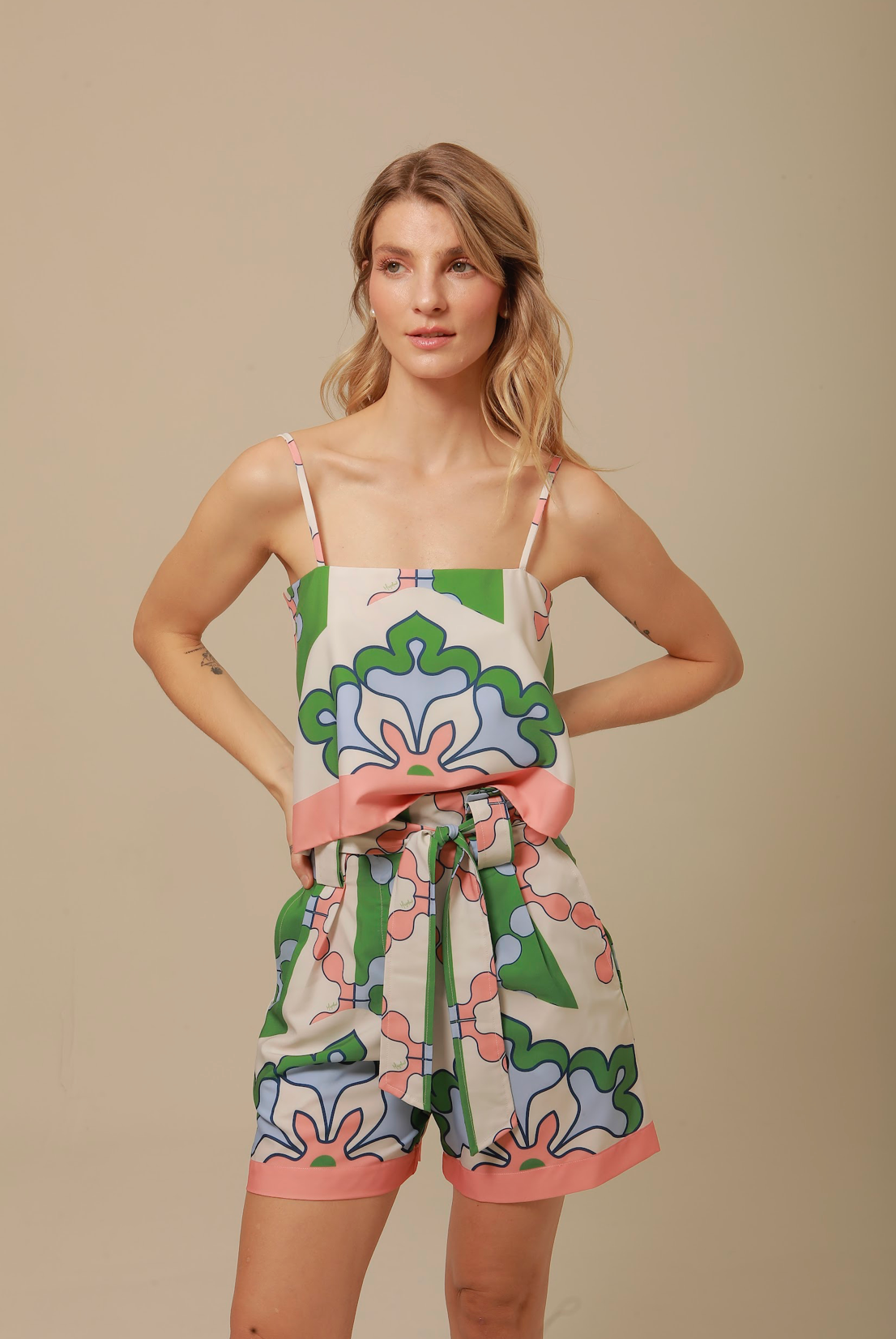 Sun-chasing made easy. The Cancún Shorts sit comfortably at the natural waist with a soft paper-bag silhouette, cinched by a detachable sash belt you can bow or knot. Crafted from the same fluid viscose blend as the matching camisole, they show off an oversized tropical-tile motif in sorbet pink, jade and ocean-blue—finished with a contrast cuff for that tailored touch.