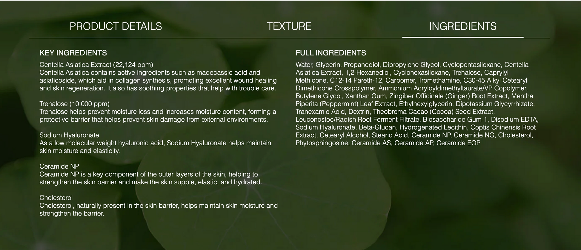 Centella Asiatica Extract, Trehalose, Sodium Hyaluronate, Ceramide NP, Cholesterol.