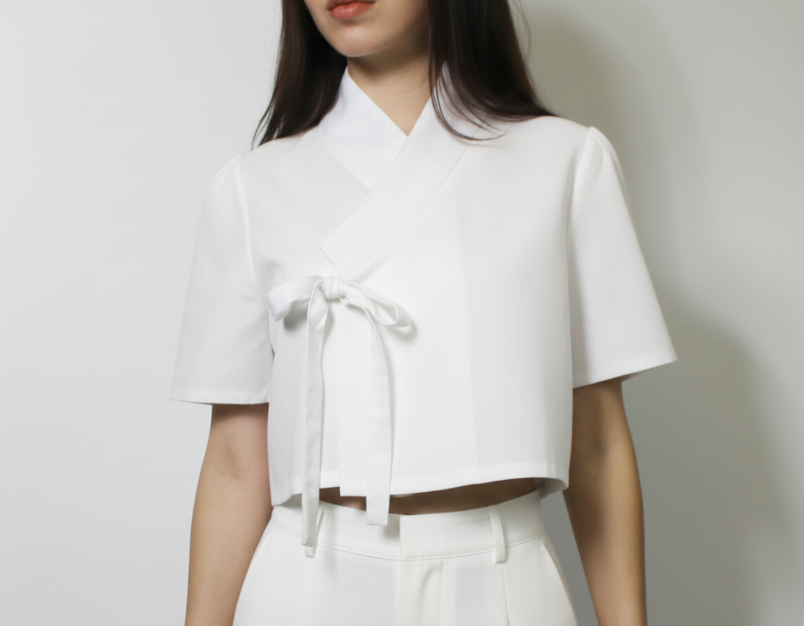 A contemporary homage to the traditional hanbok, the Hanazul Top features a wrap-style front with a soft ribbon tie and contrast collar. Its cropped silhouette and short sleeves offer a modern, relaxed edge in a fresh powder blue tone.