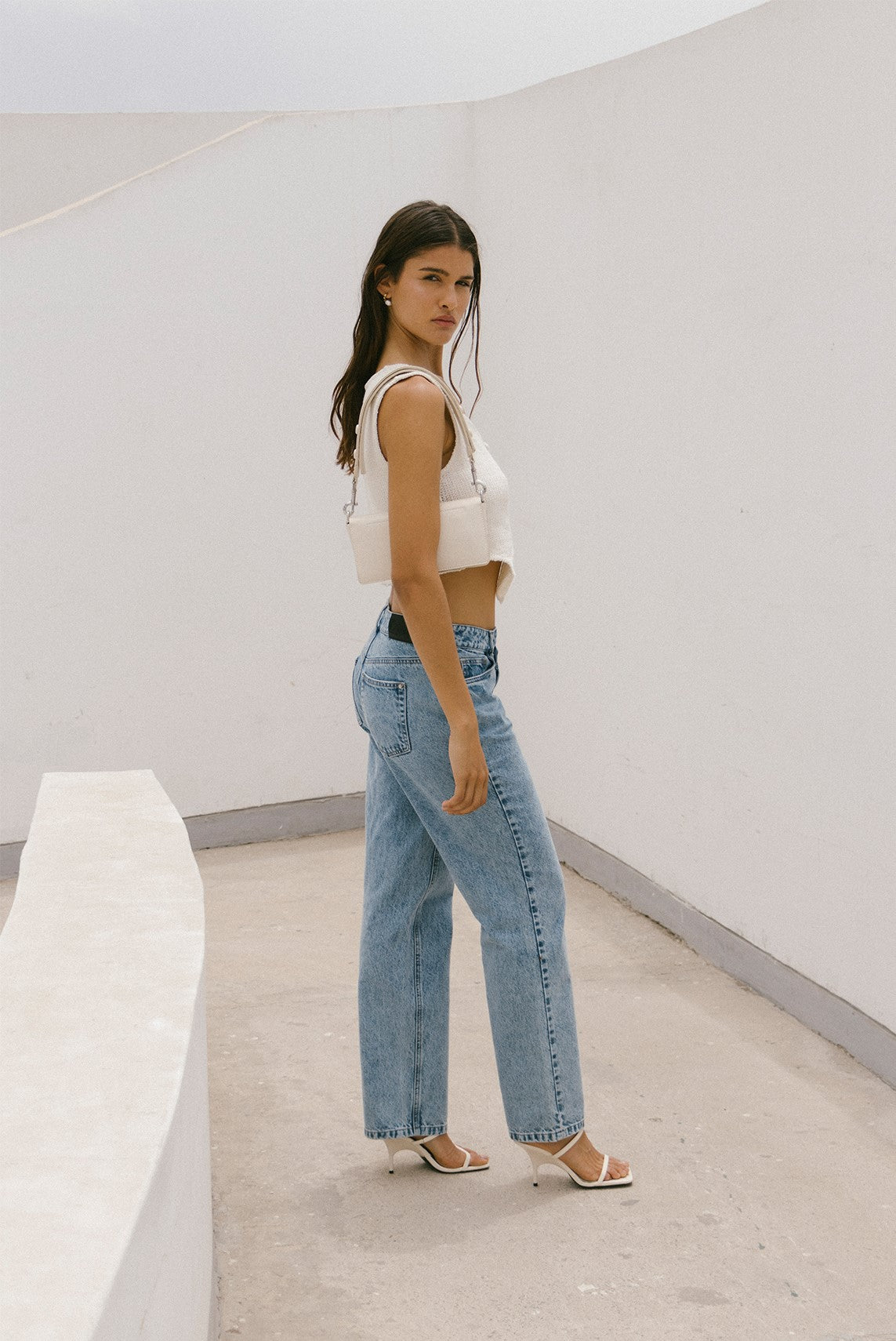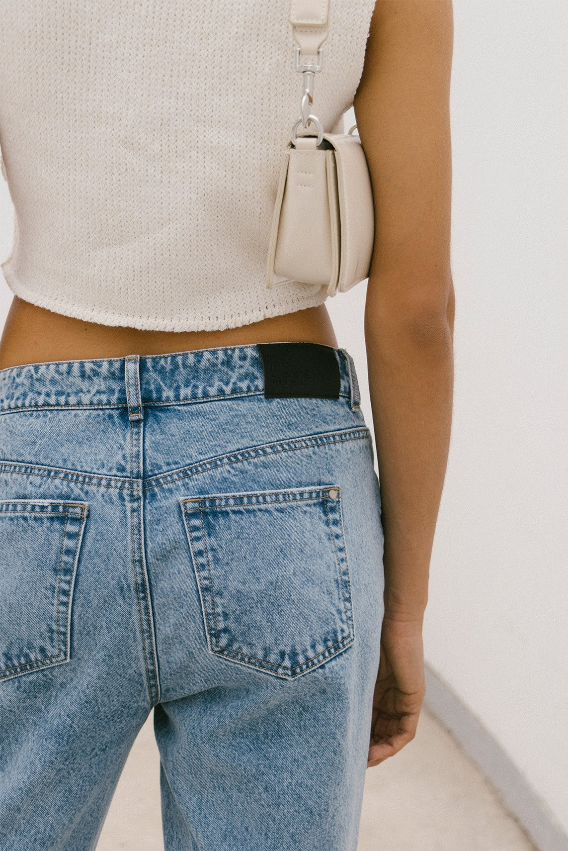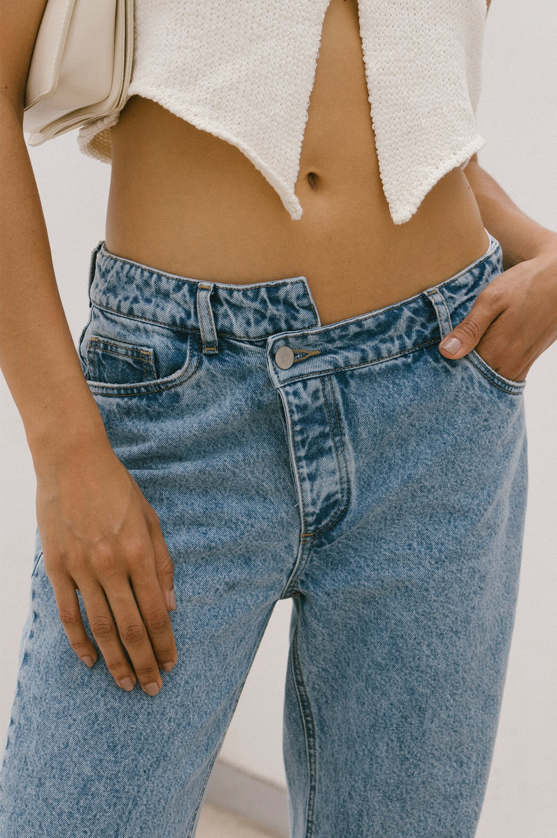 Jeans fit recto, con detalle de gareta asimétrica. Denim rígido.