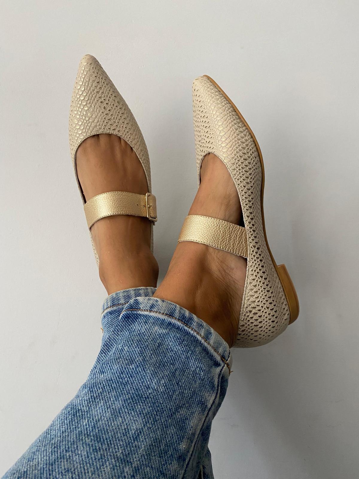 Subtle, modern, and full of elegance — these cream-colored flats with a textured finish strike the perfect balance between comfort and style. The pointed toe elongates the foot for a flattering silhouette, while the gold buckle strap adds a touch of classic sophistication. Versatile and timeless, they pair beautifully with casual jeans or can elevate a more polished office look. A refined essential that goes with everything.