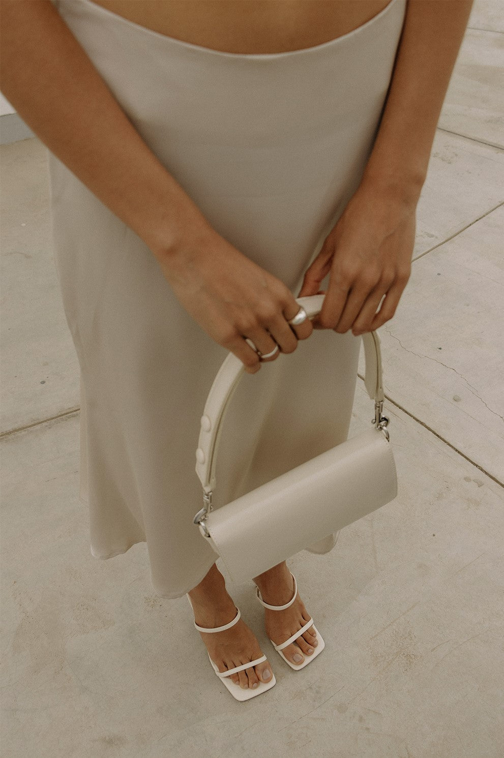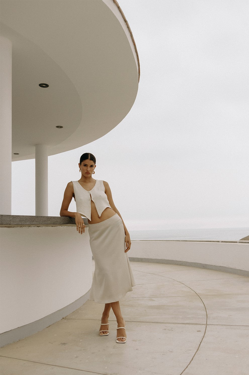 Falda de satín midi, semi cadera c/cierre invisible en costado.