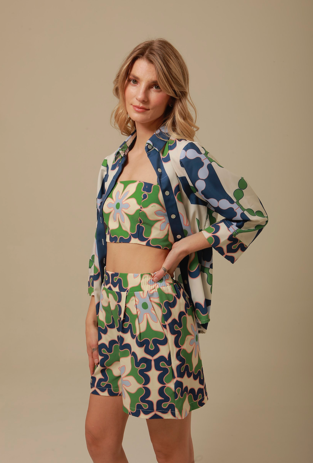 The not-so-basic layer that pulls the whole set together. Our Nina Strappy Bandeau Mini Top keeps the clean, cropped bustier vibe and adds two slim, adjustable straps for extra security—perfect for styling under the Tulum camp shirt or wearing solo when the temperature rises. Cut from the same silky viscose blend, it spotlights the bold daisy-meets-geo motif in sage, navy and sky over buttery cream.